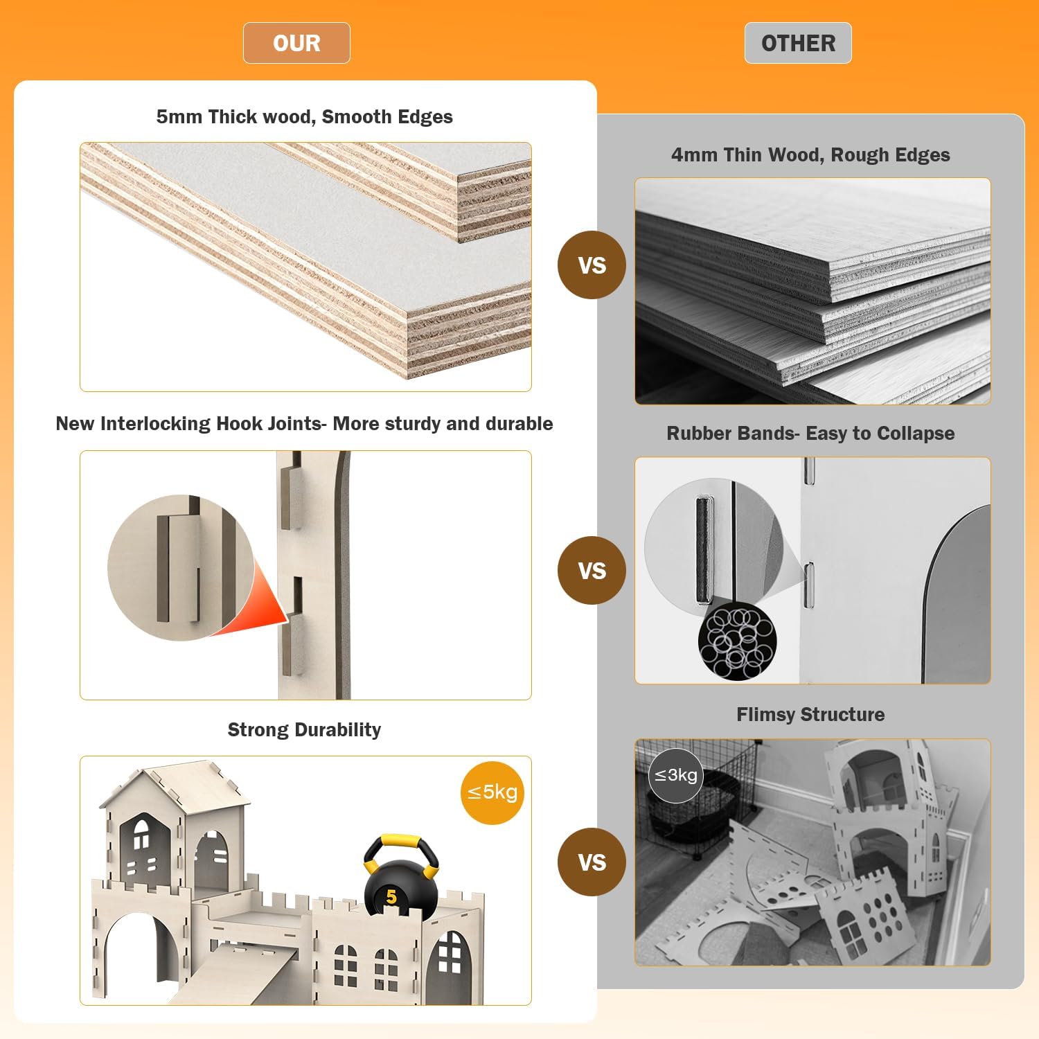 - 【Rubber-Band-Free Setup for Nervous Chewers】:Say goodbye to dangerous rubber bands! Our rabbit houses and hideouts feature new lnterlocking Hook Joint that secure panels tightly without hazardous parts – a critical upgrade praised by rabbit rescue groups.