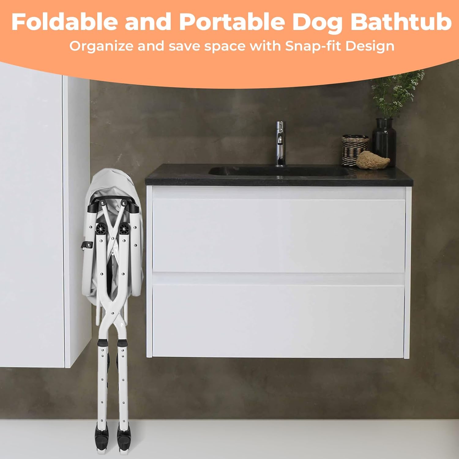 - Space-Saving & Portable. Fold the dog bathing station in seconds with one hand! Compact 7-inch width makes it ideal for small spaces. Store it in closets, garages, or even carry it for travel