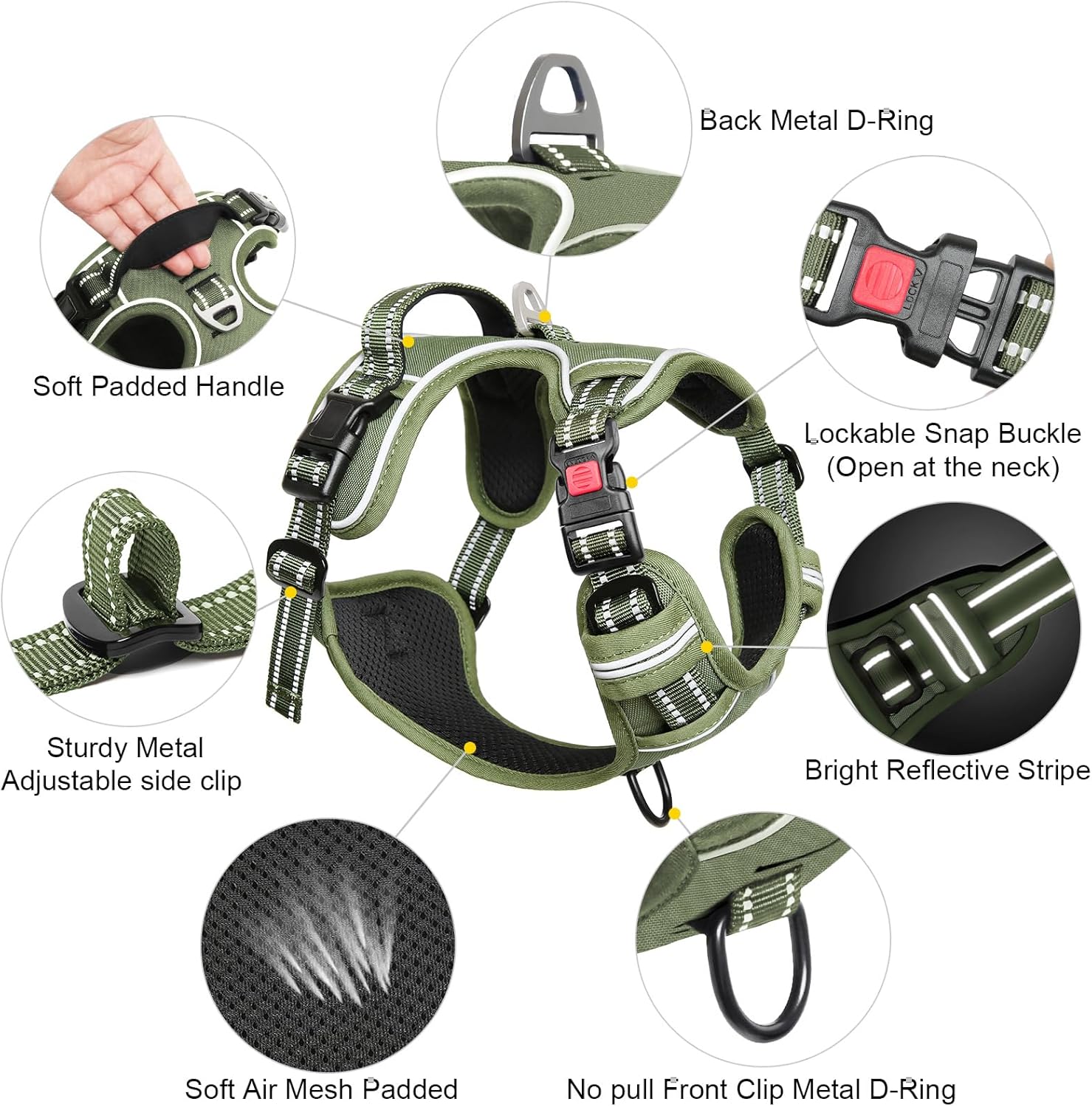 Timos Dog Harness Large Sized, No Pull Pet Harness with Neck Lockable Snap,No Choke Front Clip Dog Reflective Vest,Adjustable Metal Rings 3 Buckles,Easy Control Handle for Large Dogs Green L