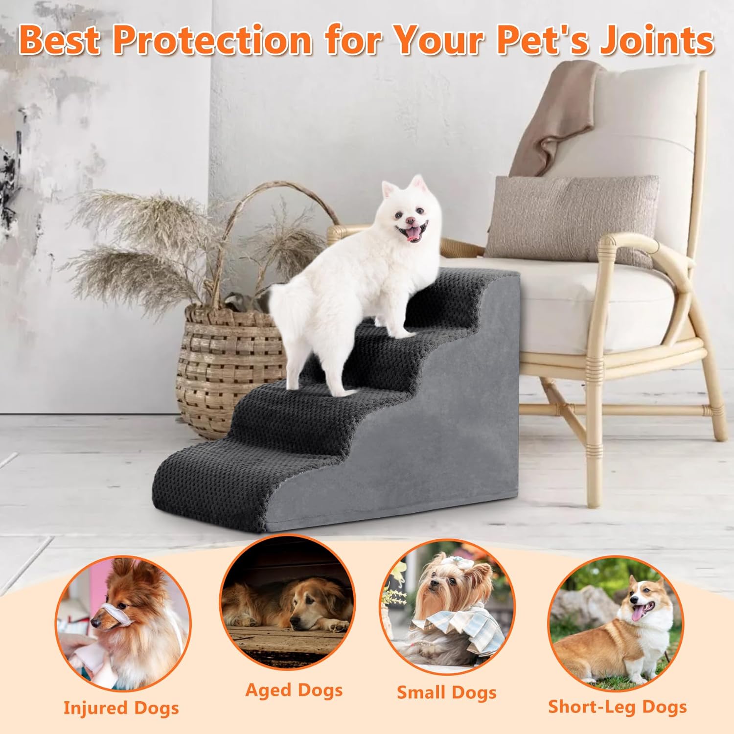 - 【Safe and Sturdy】Made of 30 D high density foam, our dog steps for small dogs have excellent firmness and resilience. So, our pet stairs can reduce the pressure on pets'legs and effectively protect pets'knee joints. Provide our pets with the best protection.