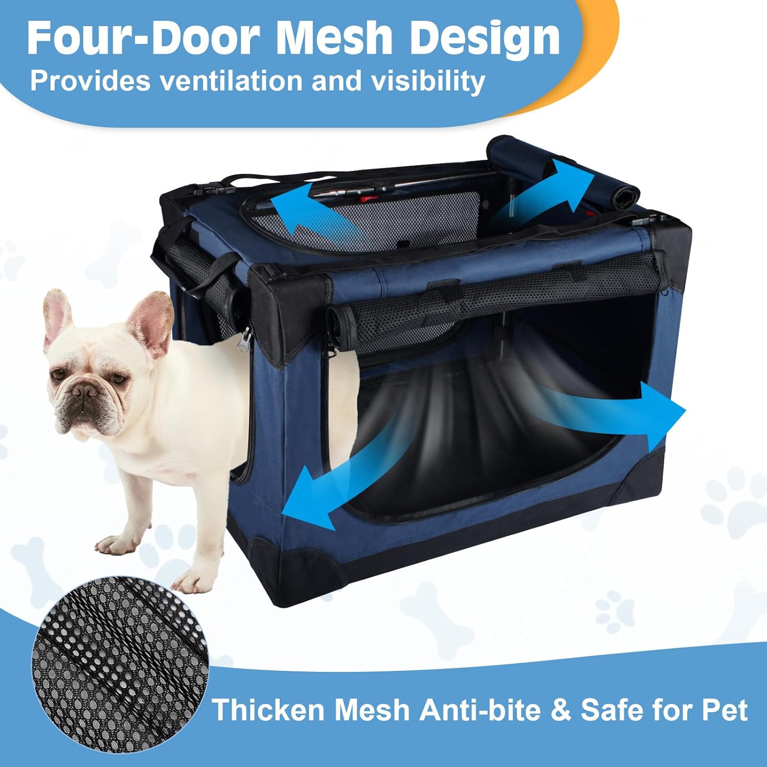 - 【Maximum Ventilation & Visibility】Constructed with a robust steel tubing frame and a cover made of premium 600D fabric plus anti-bite mesh, this foldable pet crate offers a secure, comfortable, and well-ventilated space for your dog. Its FOUR mesh doors maximize airflow and provide clear views, making it an ideal lightweight and stylish travel dog crate