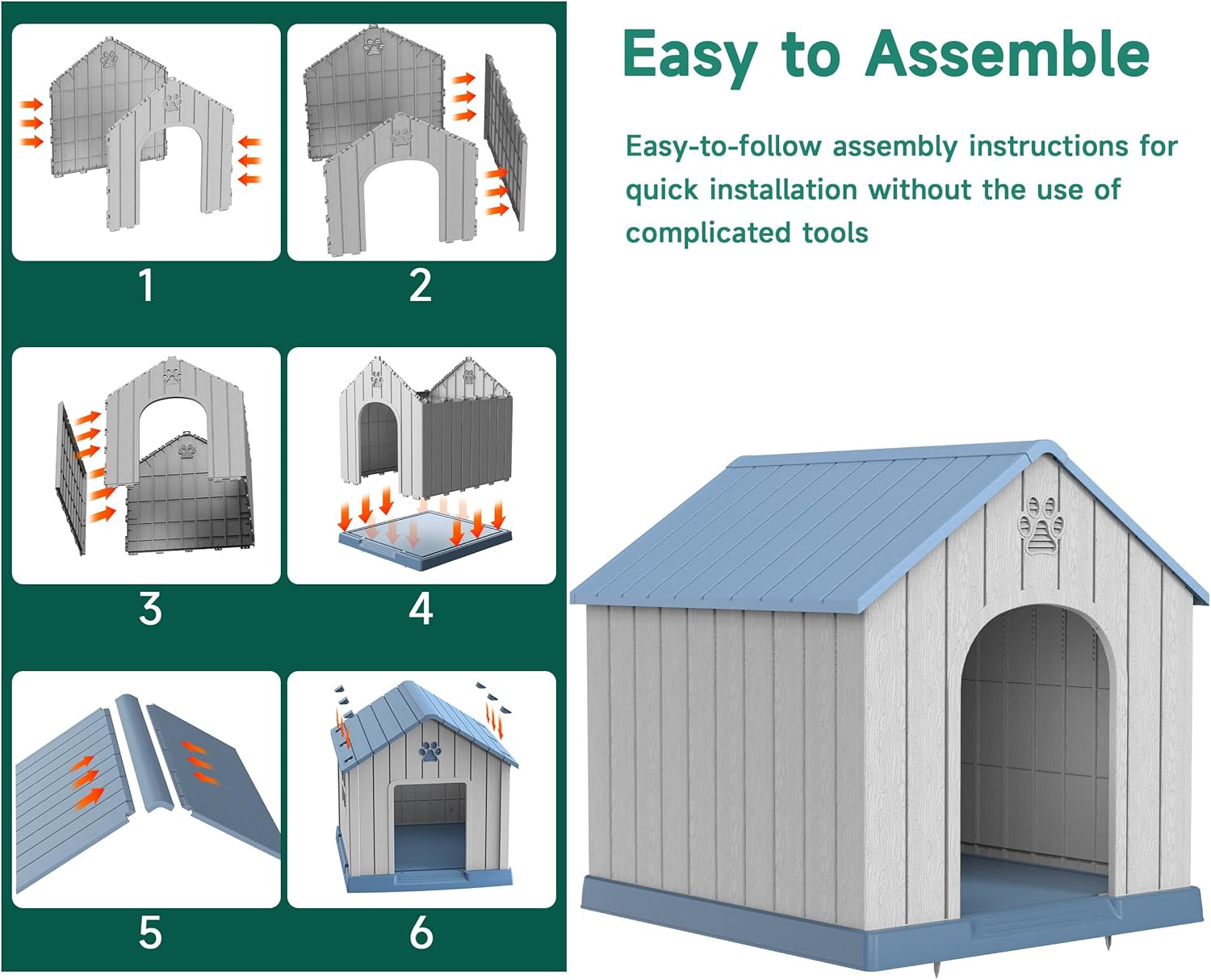 - Sturdy and Durable: This big dog house is made of high quality PP (polypropylene) material, which is extremely durable.The PP material is scratch-resistant, abrasion-resistant, and also waterproof. It can withstand all kinds of weather conditions, such as rain and sunlight exposure, and is not easily damaged.