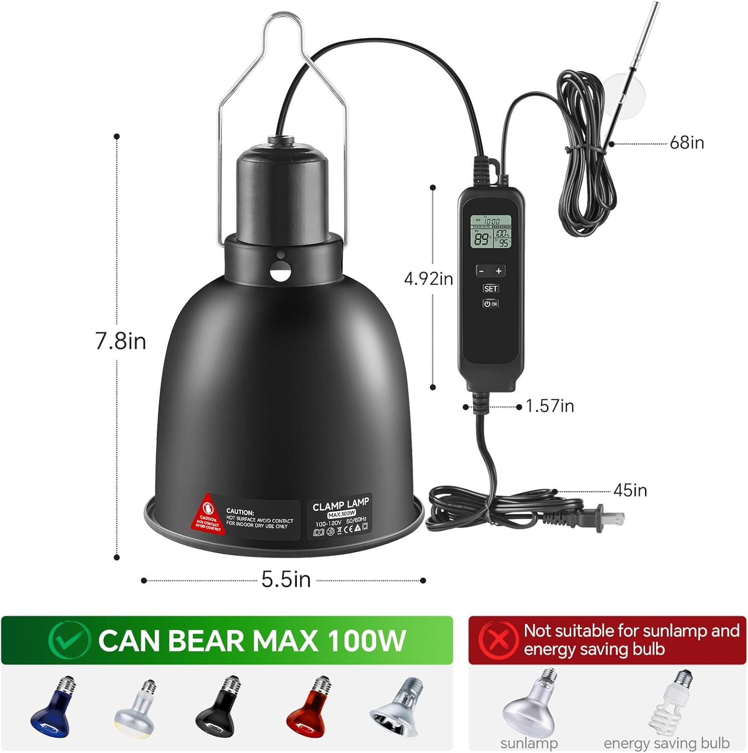 5.5 inch Reptile Heat Lamp Fixture with Thermostat and Timer,Reptile Light Fixture with Dimming Thermostat Max 100W,PID Temperature Controller for UVB Lights,Basking Heat bulbs and Terrariums