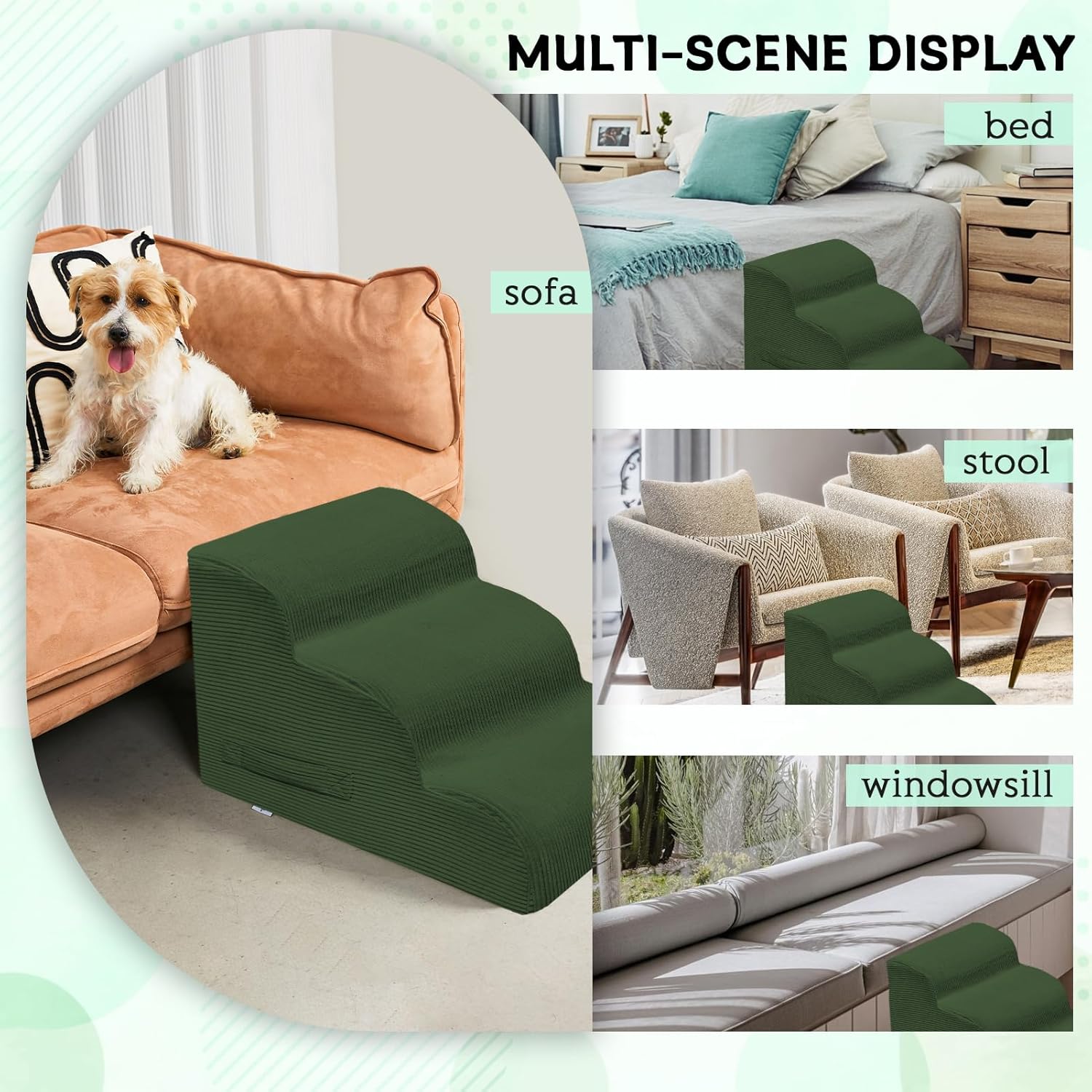 Dog Steps for Small Dogs, 4-Step Pet Ramp Stairs for High Beds and Sofa, Non-Slip Pet Stairs for Small Dogs and Cats, Removable and Easy to Clean Cover, Green