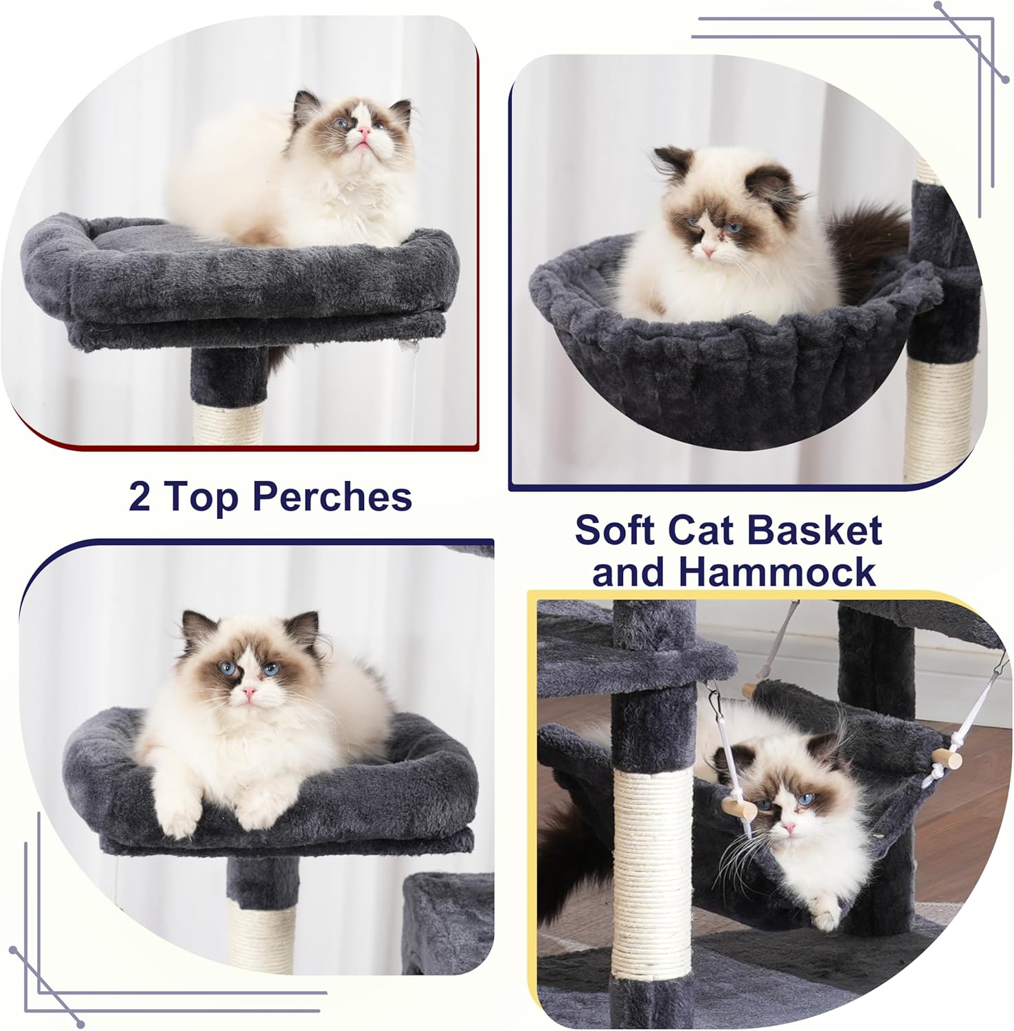 - More Funs from The Large Cat Tree: The comfortable hammock, the deep hanging basket, the cat scratching posts where cats can sharpen their claws at will, and the suspended fur balls all contribute to creating a warm and cozy living environment for cats.