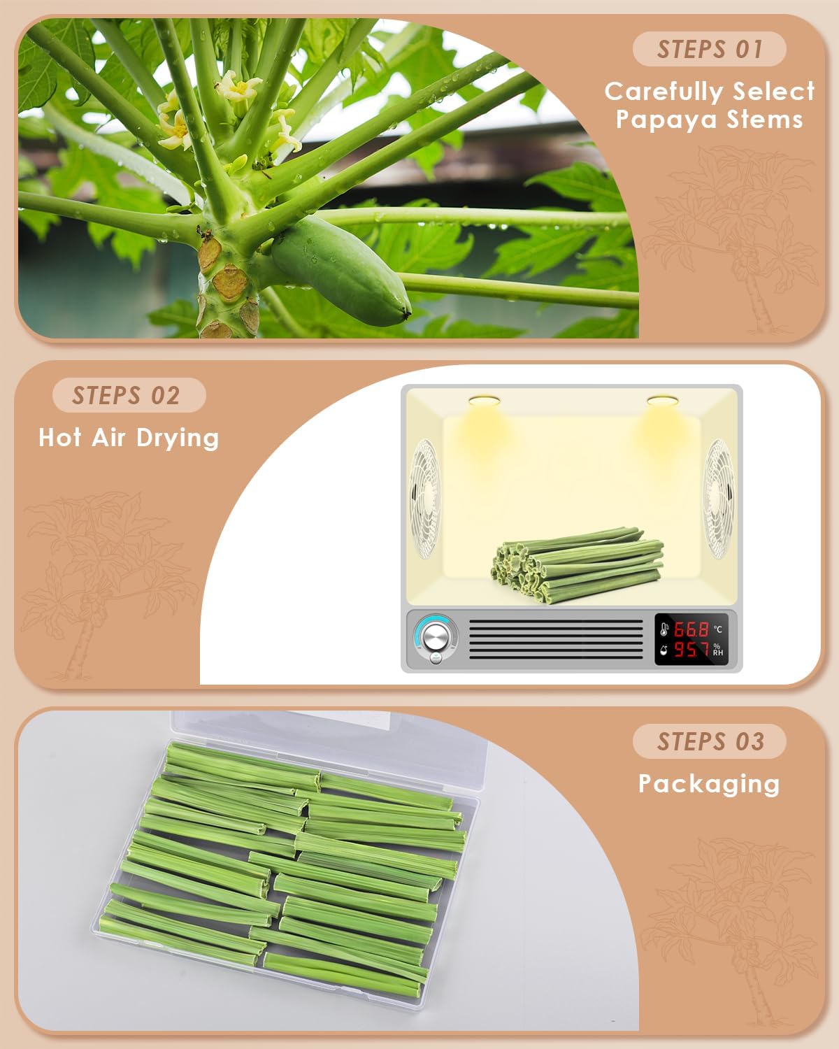 - Sealed Snack Packaging: Guinea Pigs chew sticks grow in the natural environment and are produced through the process of felling → pruning → washing → drying → sorting → packaging. When packing, choose high-quality and dry a suitable size papaya stem stick then put it in a bag to ensure Long term storage without spoilage