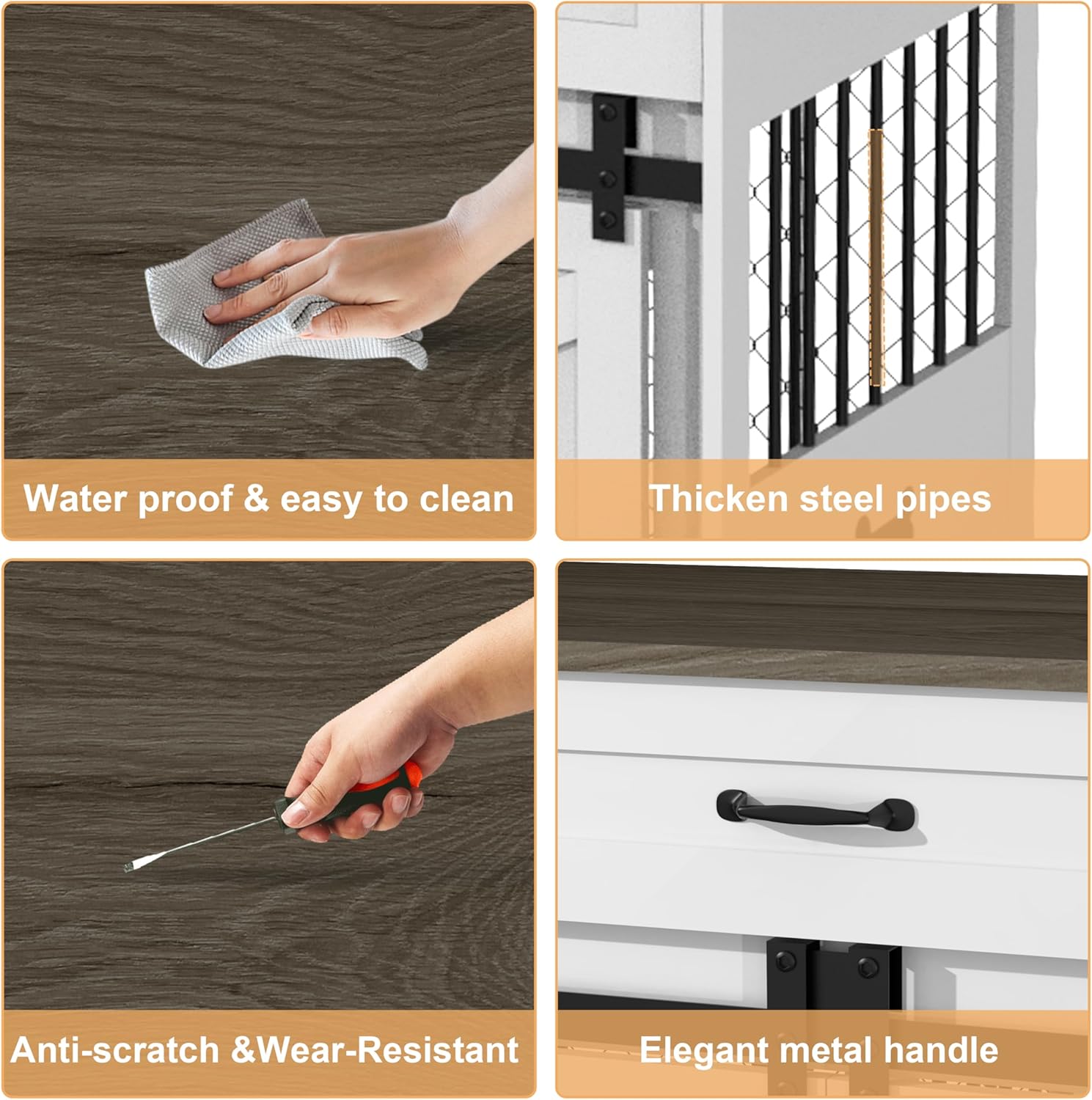 - Durable Construction with Enhanced Features: Constructed from heavy-duty materials, this dog crate furniture withstands the wear and tear of daily use. The upgraded iron mesh back replaces dull wooden panels, providing better airflow and visibility for your pets, ensuring a safe and comfortable environment.