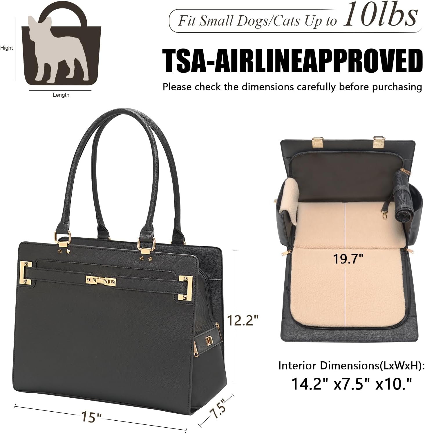 - Spacious Pet Bag Carrier:Designed with a roomy interior to give your pet plenty of space to sit, lie down comfortably. Carrier Dimensions(LxWxH): 15inch x 7.5inch x 12.2inch. Interior Dimensions(LxWxH): 14.2inch x 7.5inch x 10.6inch. We recommend this pet carrier for pets under 10 lbs. Please check the dimensions carefully before purchasing to ensure it fits your dog/cat/rabbit/other pets
