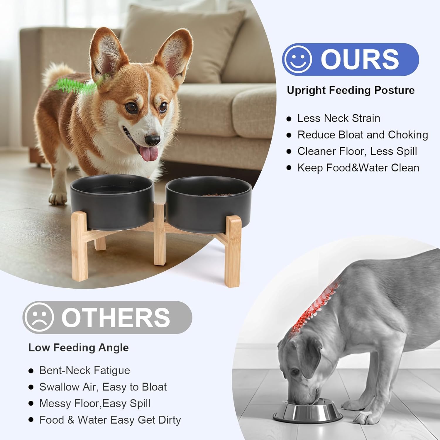 - Stable, Tip‑Resistant Design – A solid bamboo frame with Chew‑Resistant Heavyweight Ceramic, wide stance, and slip‑proof silicone pads join forces to create raised dog bowls that STAY IN PLACE on tile, wood, or laminate. Fewer spills mean cleaner floors and no accidental gouges or scratches or noisy