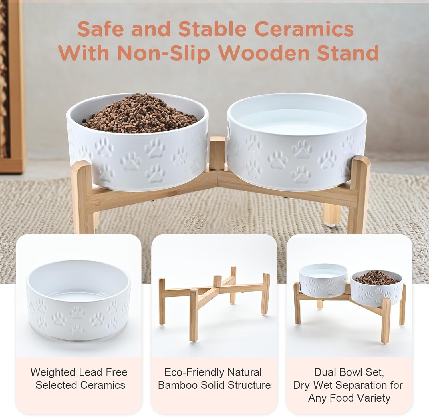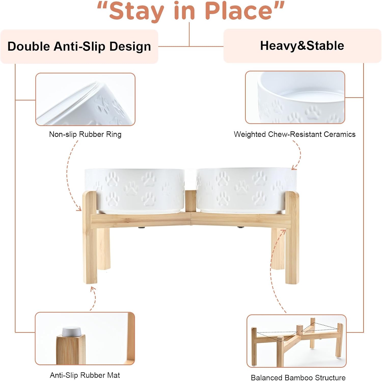 - Stable, Tip‑Resistant Design – A solid bamboo frame with Chew‑Resistant Heavyweight Ceramic, wide stance, and slip‑proof silicone pads join forces to create raised dog bowls that STAY IN PLACE on tile, wood, or laminate. Fewer spills mean cleaner floors and no accidental gouges or scratches or noisy