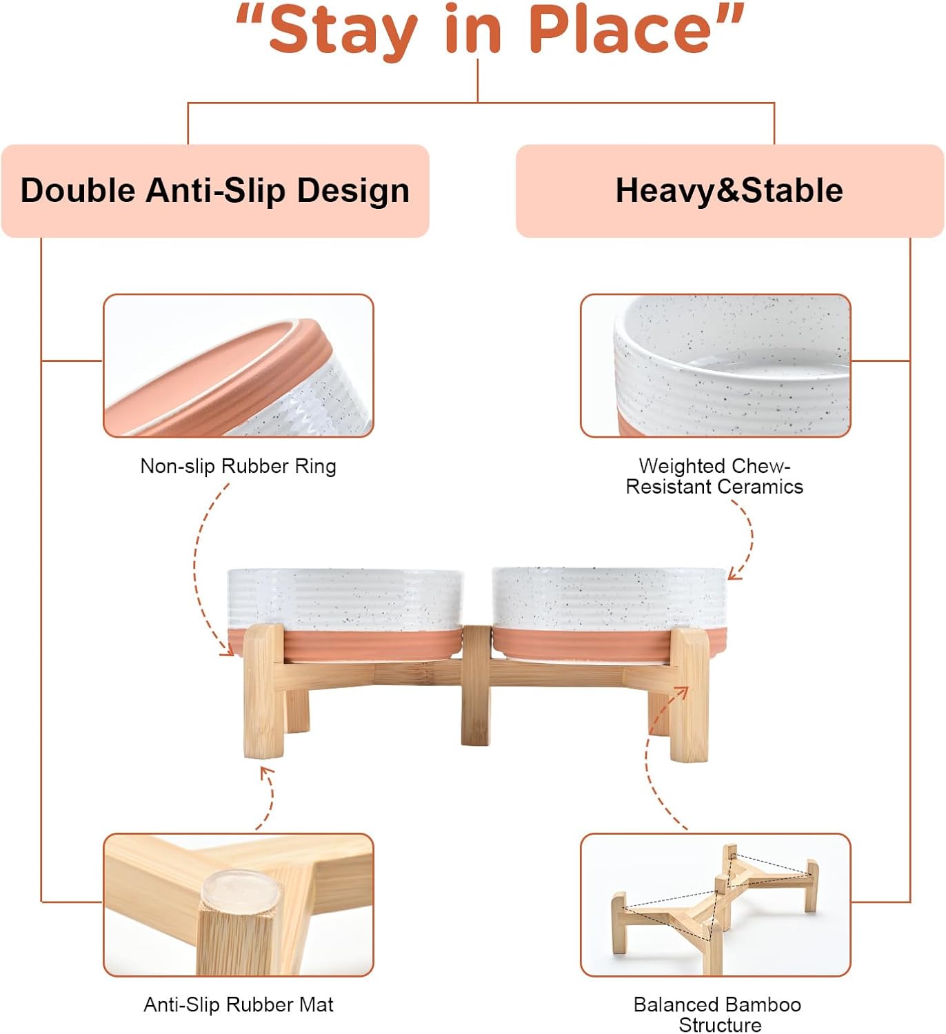 - Stable, Tip‑Resistant Design – A solid bamboo frame with Chew‑Resistant Heavyweight Ceramic, wide stance, and slip‑proof silicone pads join forces to create raised dog bowls that STAY IN PLACE on tile, wood, or laminate. Fewer spills mean cleaner floors and no accidental gouges or scratches or noisy