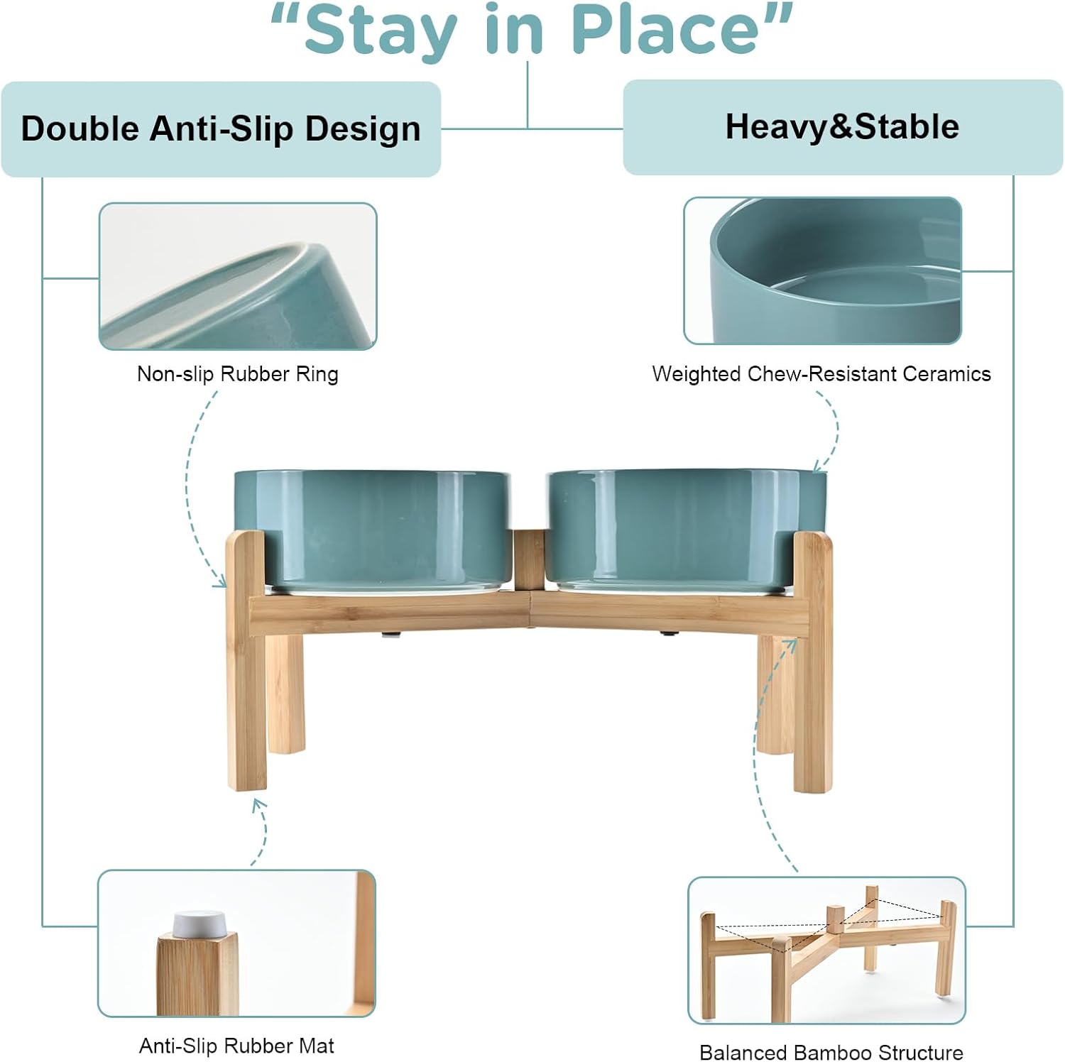 - Stable, Tip‑Resistant Design – A solid bamboo frame with Chew‑Resistant Heavyweight Ceramic, wide stance, and slip‑proof silicone pads join forces to create raised dog bowls that STAY IN PLACE on tile, wood, or laminate. Fewer spills mean cleaner floors and no accidental gouges or scratches or noisy