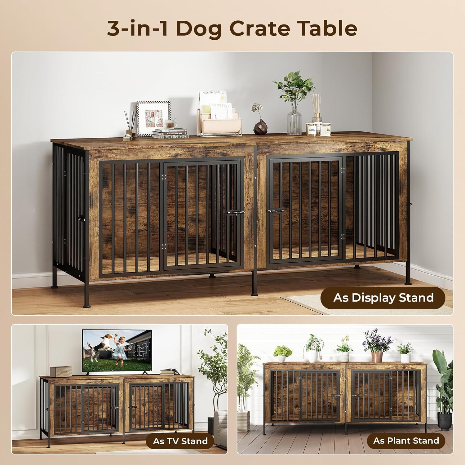 78 Inch Dog Cage Furniture for 2 Large/Medium Dogs with Removable Divider, Extra Large Double Doors Dog Kennel, XXL Thick Wooden Dog cage Furniture, Durable and Sturdy, Brown