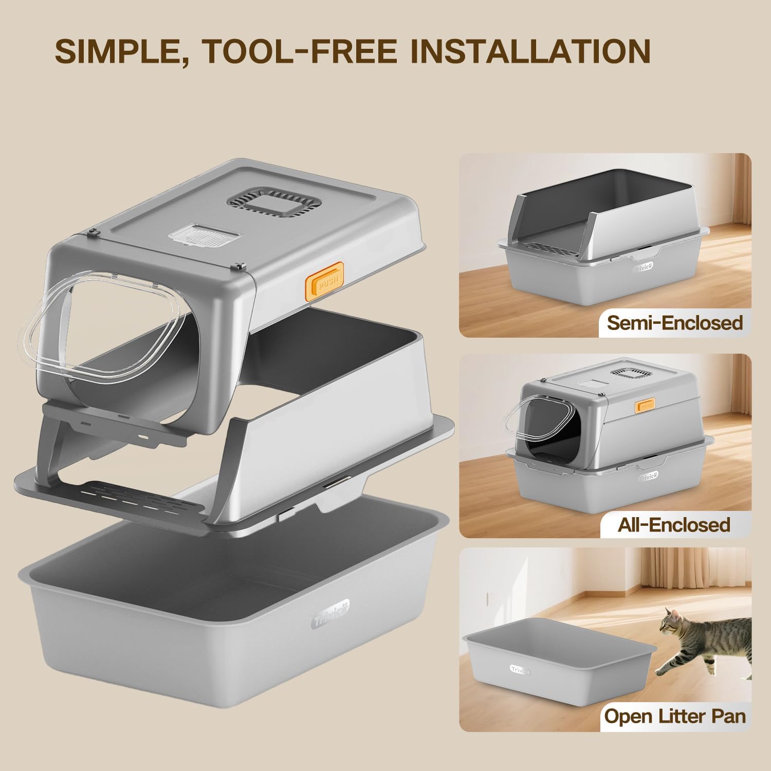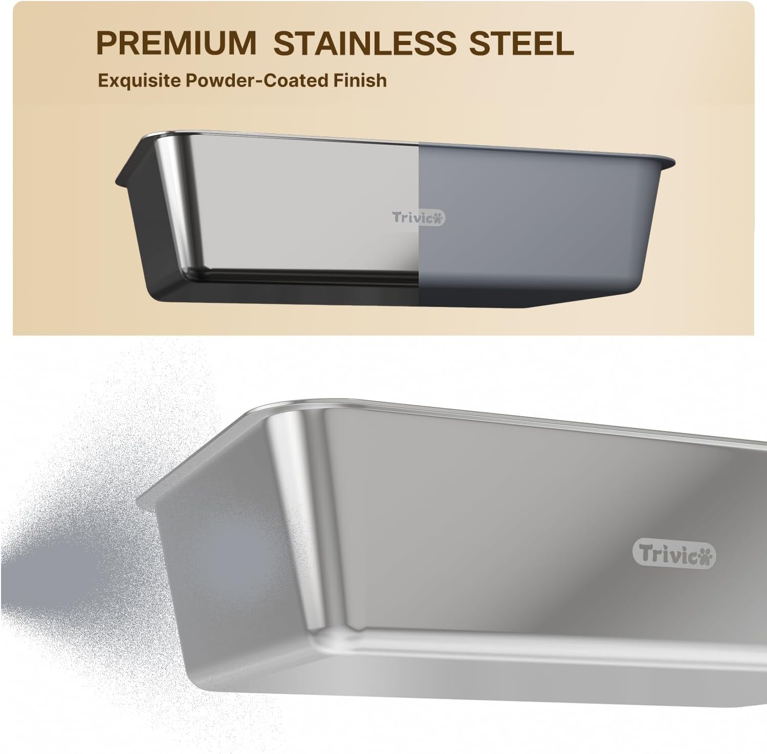 - Premium Stainless Steel Litter Pan(Exquisite Powder-Coated Finish). Unlike traditional plastic trays, this cat litter box features a high-quality stainless steel bottom with a durable powder-coated finish. It’s scratch-resistant, non-stick, and easy to clean—no more lingering odors or trapped litter clumps. Designed to stay cleaner for longer, offering both durability and hygiene for your feline friend.
