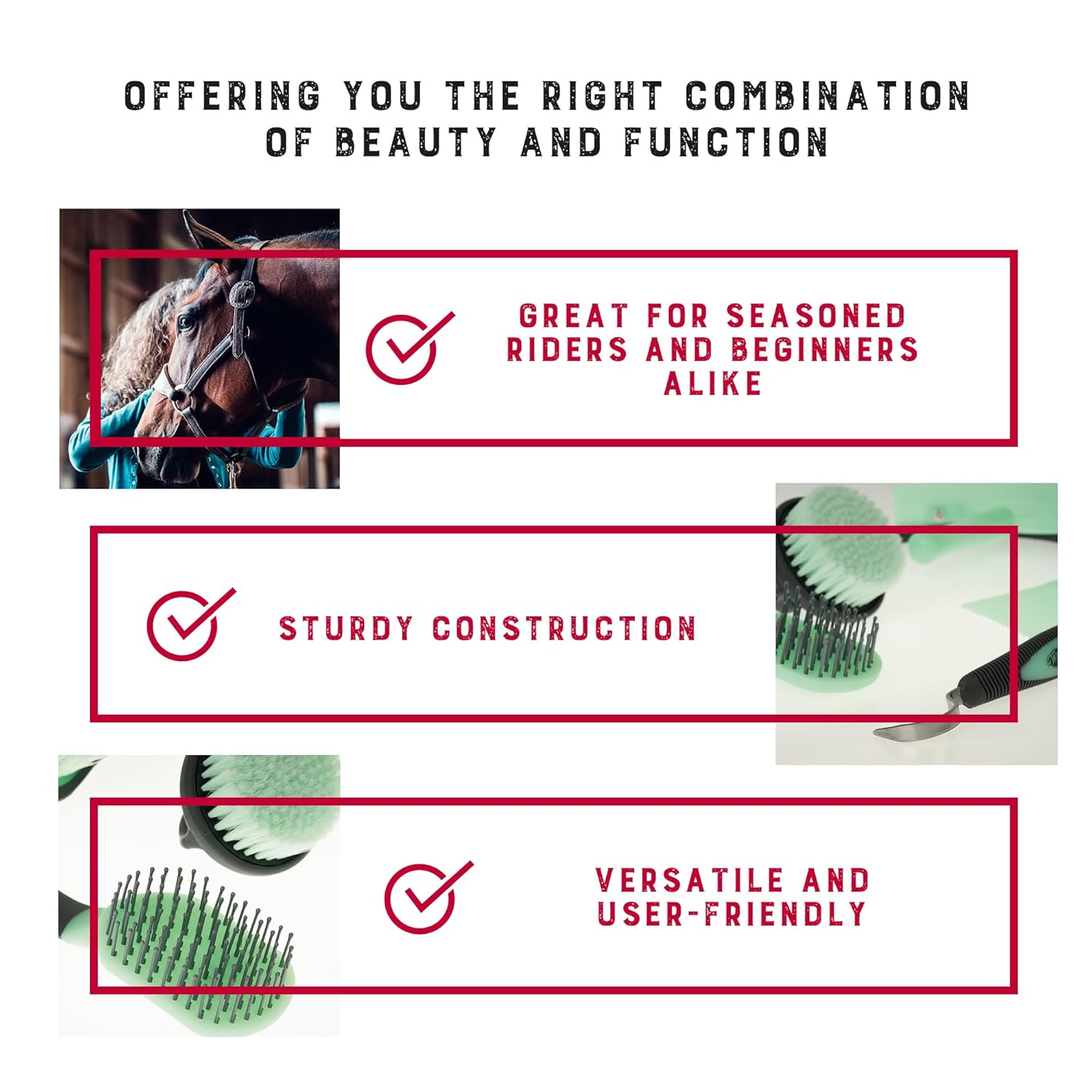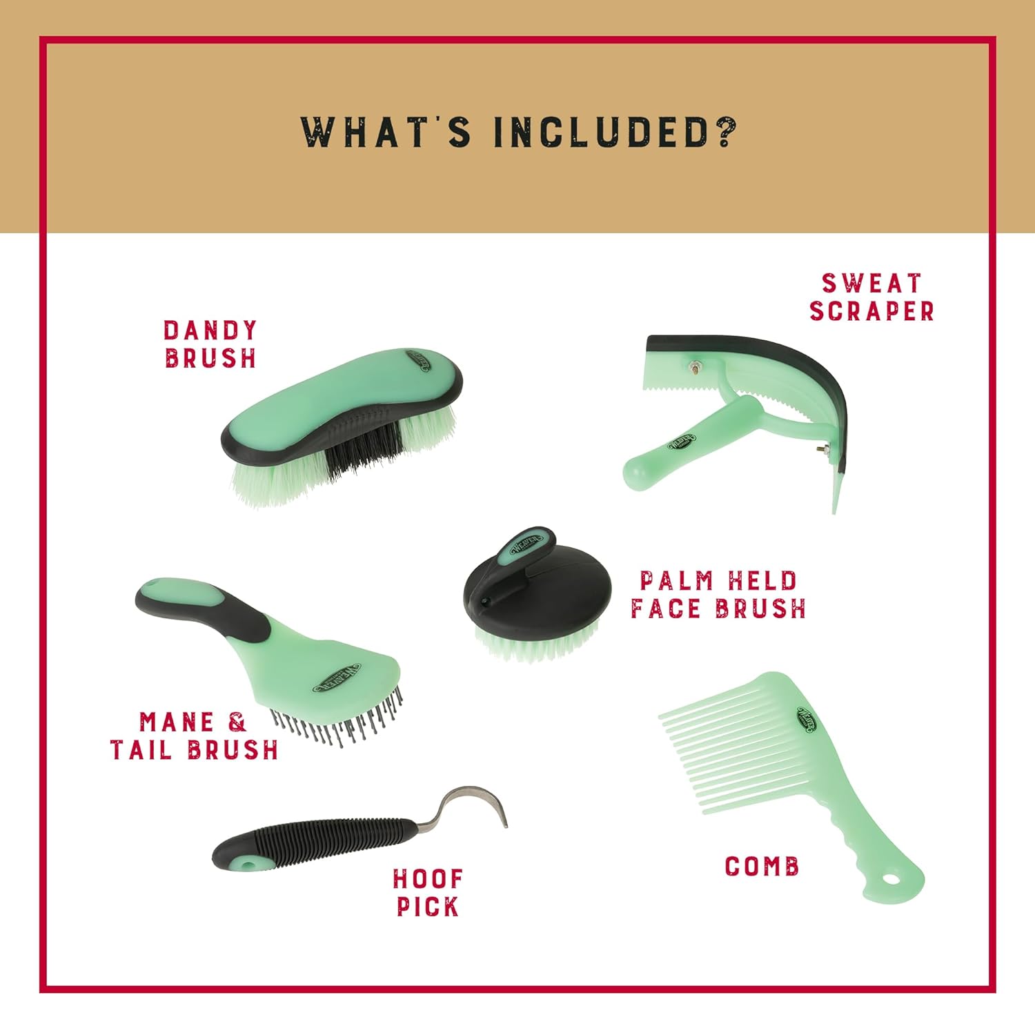 - Horse Grooming Kit: Ensure effortless cleaning and grooming of your horses with our horse grooming set; these 6-piece horse essentials include a comb, hoof pick, palm-held brush, mane and tail brush, dandy brush, and sweat scraper/coarse curry combo