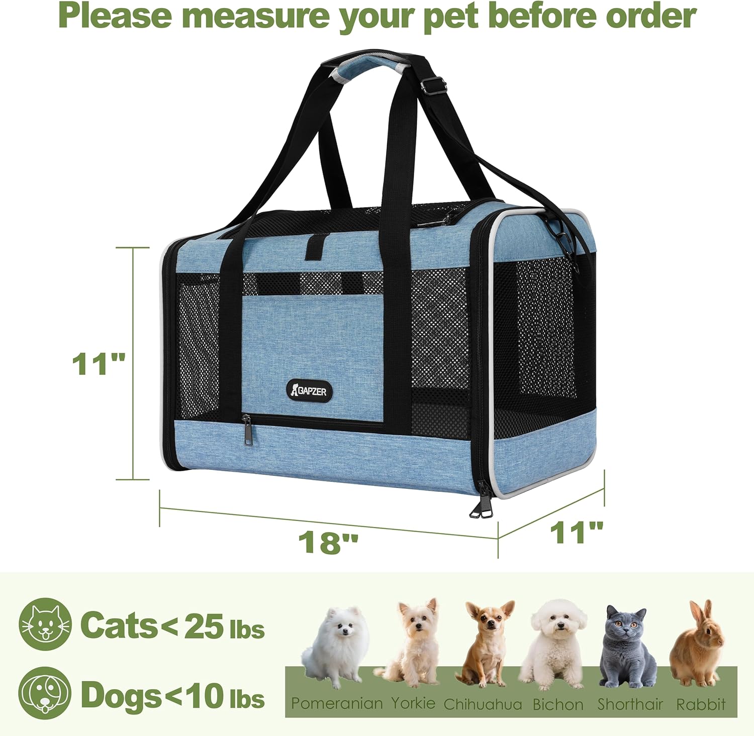 - Spacious Soft-Sided Pet Carrier - 18x11x11 inch crate comfortably fits medium size pets, such as cats weighing 15-25 lbs or 10 pounds small dogs like Yorkies & Shih Tzus with room to stretch