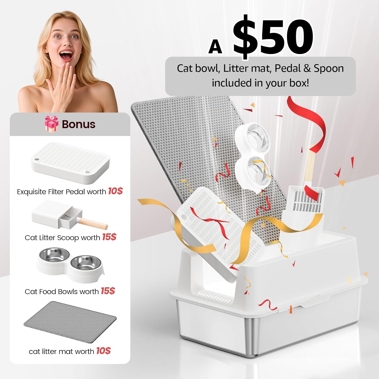 - 【UPGRADED DESIGN, DOUBLE CAPTURE】Our metal litter box now features a refined pedal with a built-in litter mat for enhanced litter trapping, plus an added cat bowl for convenience. The redesigned footboard ensures easy access for all cats, from kittens to seniors, making it perfect for their natural habits. It’s a smarter, cleaner solution for your feline friend!