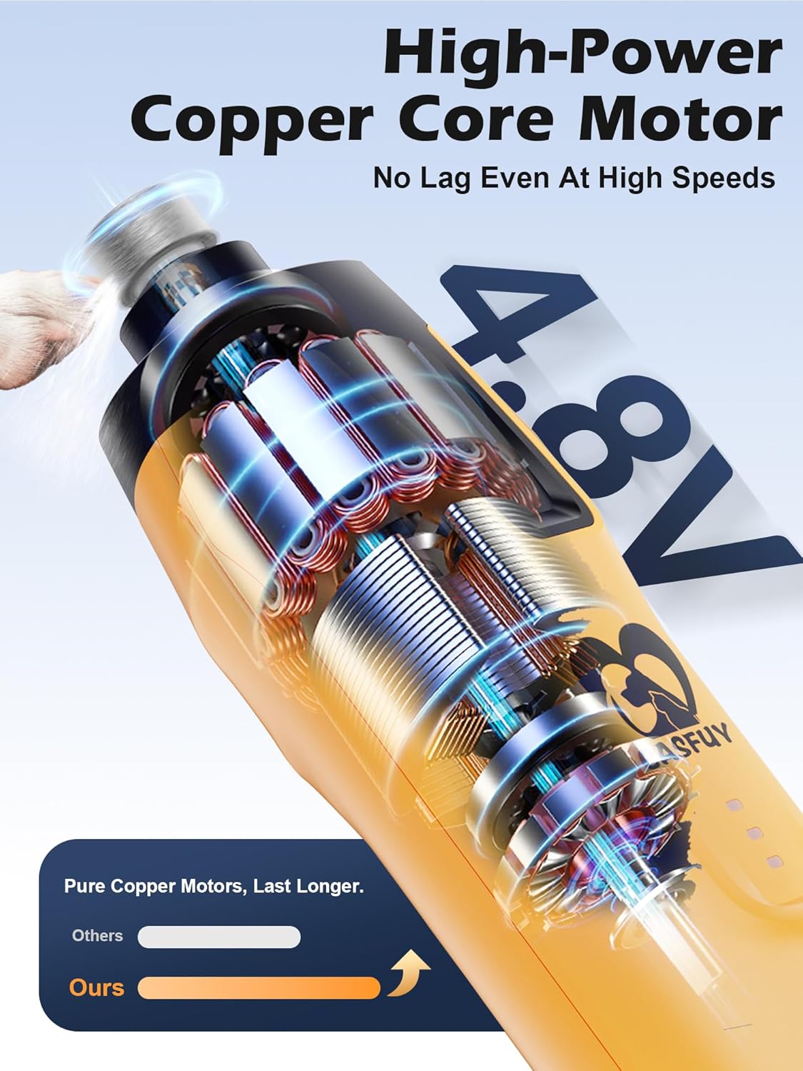 - 【4.8V Copper Core Motor - No Lag, More Power】Enhanced with 50% more torque, our powerful dog nail trimmer easily handles thick, tough nails. The durable copper core delivers smooth, stable grinding for an effortless grooming experience—even at high speeds—without stalling or slowing down.
