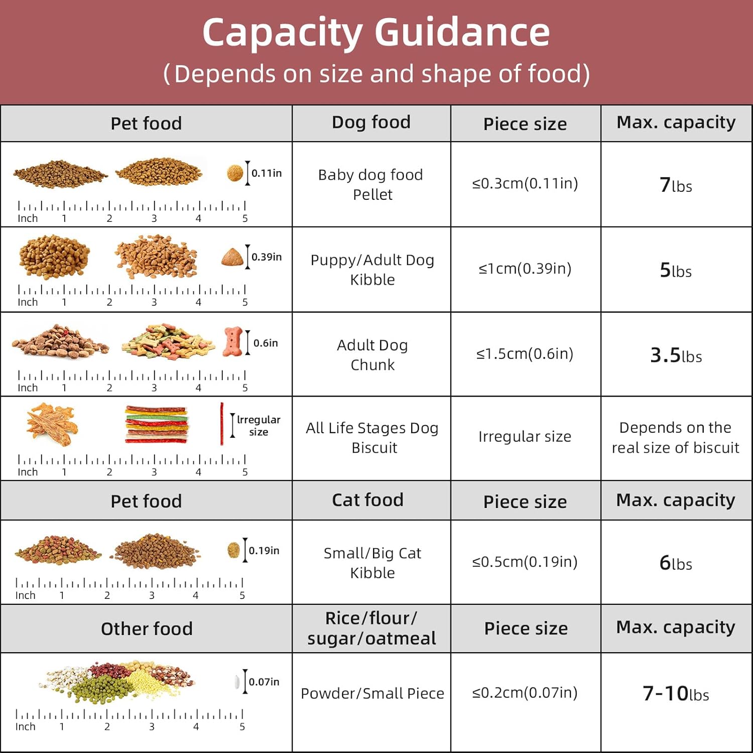 - SUPER LARGE CAPACITY : The airtight cat food container is designed with a large nozzle, so whether it is small or large pieces of food, it can be easily poured out without shaking the barrel. The handle design makes it easy to use and carry indoors and outdoors. It is also convenient to hold with one hand and tip the bucket to pour out food. The size of the pet food container is 14*12*8 inches, with a capacity of 5 liters. It can store pet food for 5 -7LBS, rice, dry food, cereals, etc. is about 10LBS, depending on the size and shape of the food. Can be easily stored and effectively save valuable space whether indoors, outdoors or during travel.