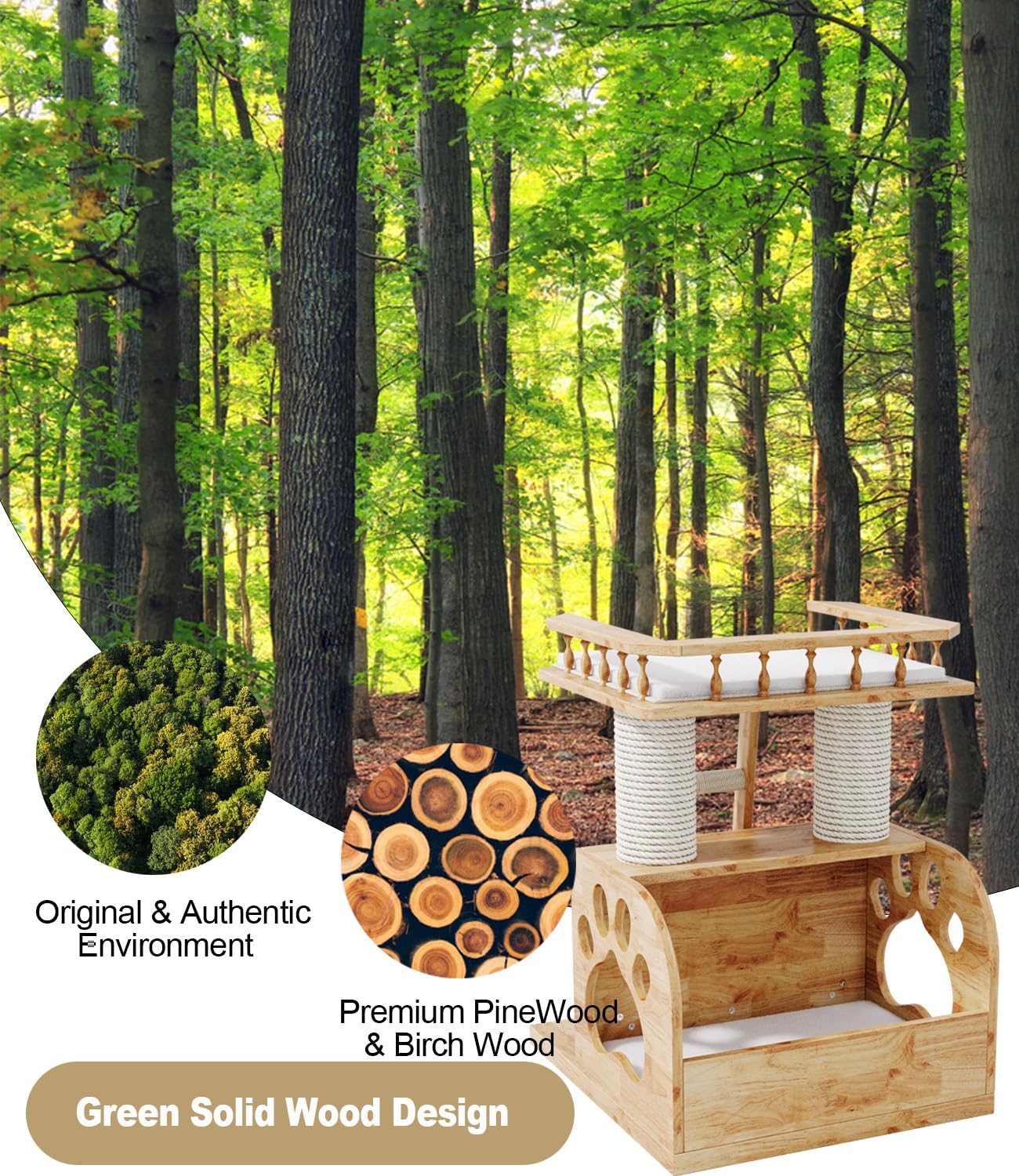 Modern Solid Wooden Cat Tree Tower, 25" Luxury Cats Trees Condo with Scratching Post, 2 Level Heavy Duty for Cat Tower Indoor Cats Adults, Natural Cats Tree House with Washable Cushions