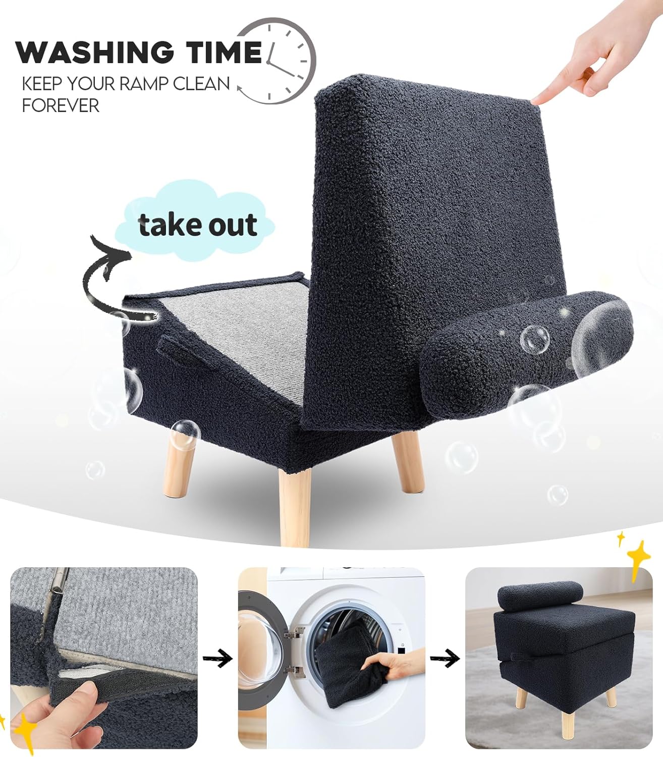 - Stylish, Pet-Friendly Construction:Features a cozy sherpa surface and sturdy wood legs that blend with your home décor. The soft, non-slip ramp surface provides secure footing for pets of all sizes and breeds.