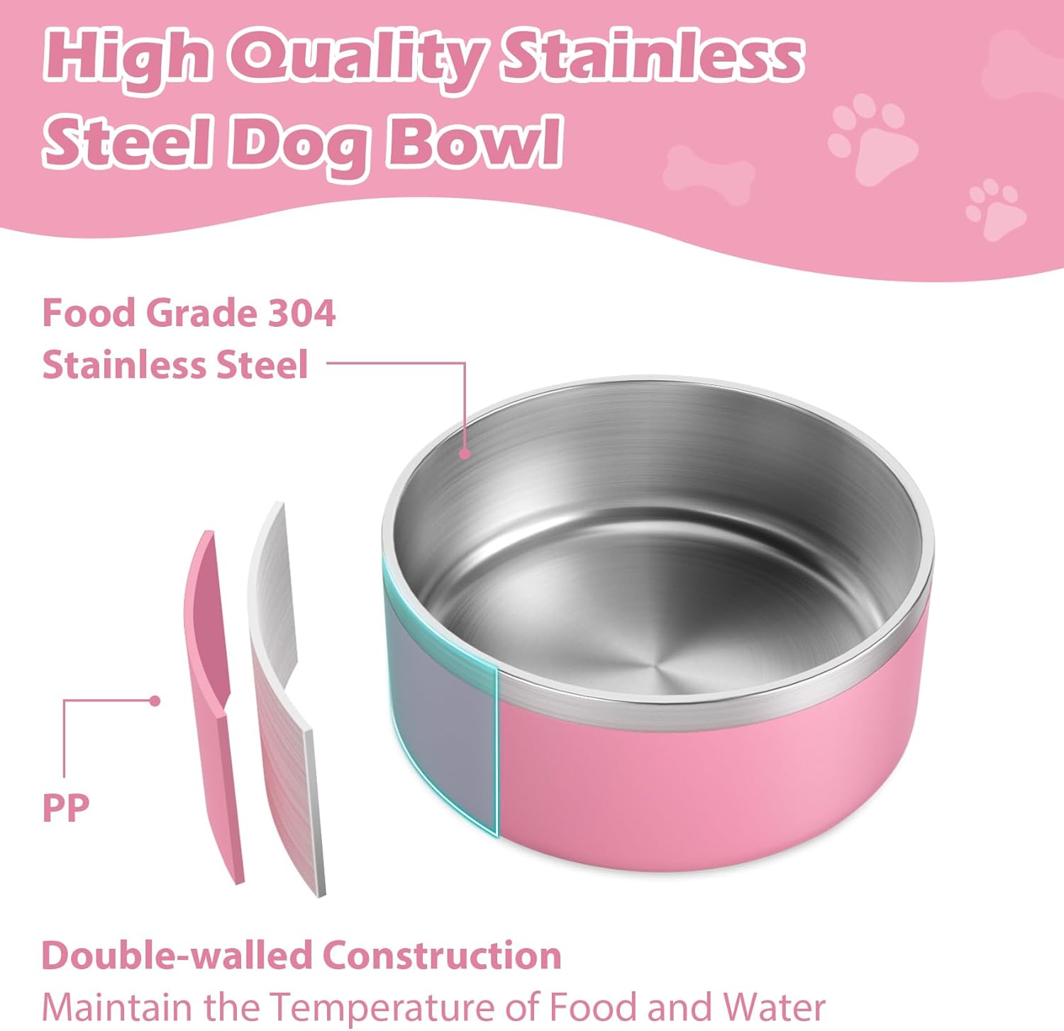 LIANLAI Dog Bowls Large Sized, Rust-Resistant Stainless Steel Dog Bowls, Non Slip Puppy Dishes, Dishwasher Safe (Pink,64 oz)