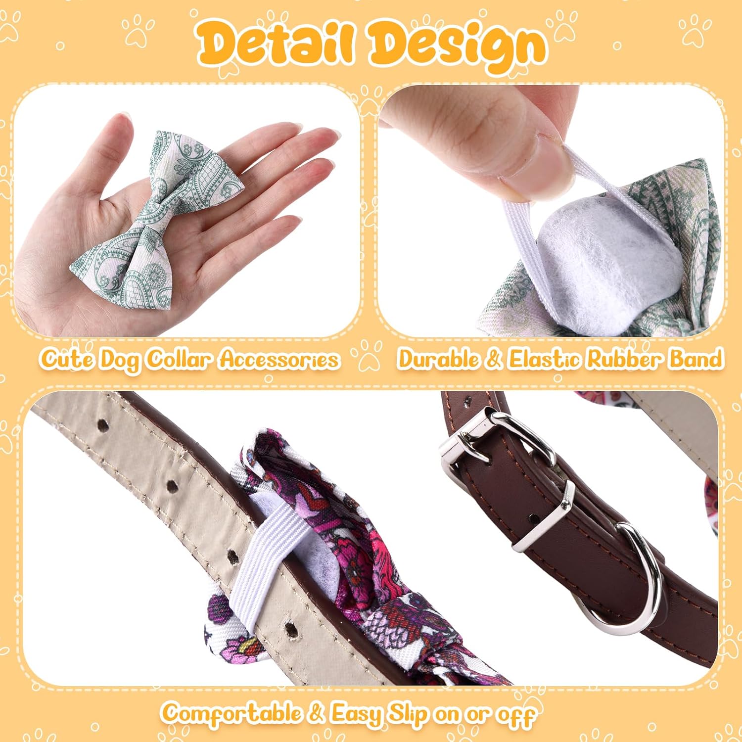- Detachable Design: dogs collar attachment bow ties are designed with gaskets and rubber bands, which are elastic and wide enough to move to the position you want; These dog collar bows ties with cute patterns and various colors can be easily changed to bring more fun and different looks