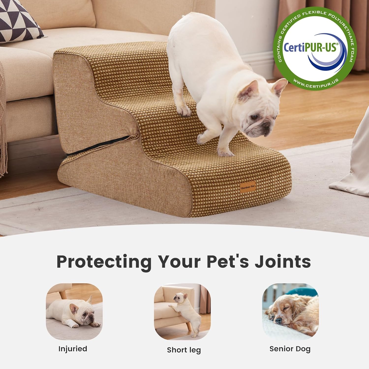 - 35D High-Density Foam: These pet stairs features a soft, low-angle ramp design with 35D high-density foam, providing optimal support and reducing stress on your dog's joints. Ideal dog stairs for small dogs and medium dogs, especially those with knee injuries or older pets who need extra care.