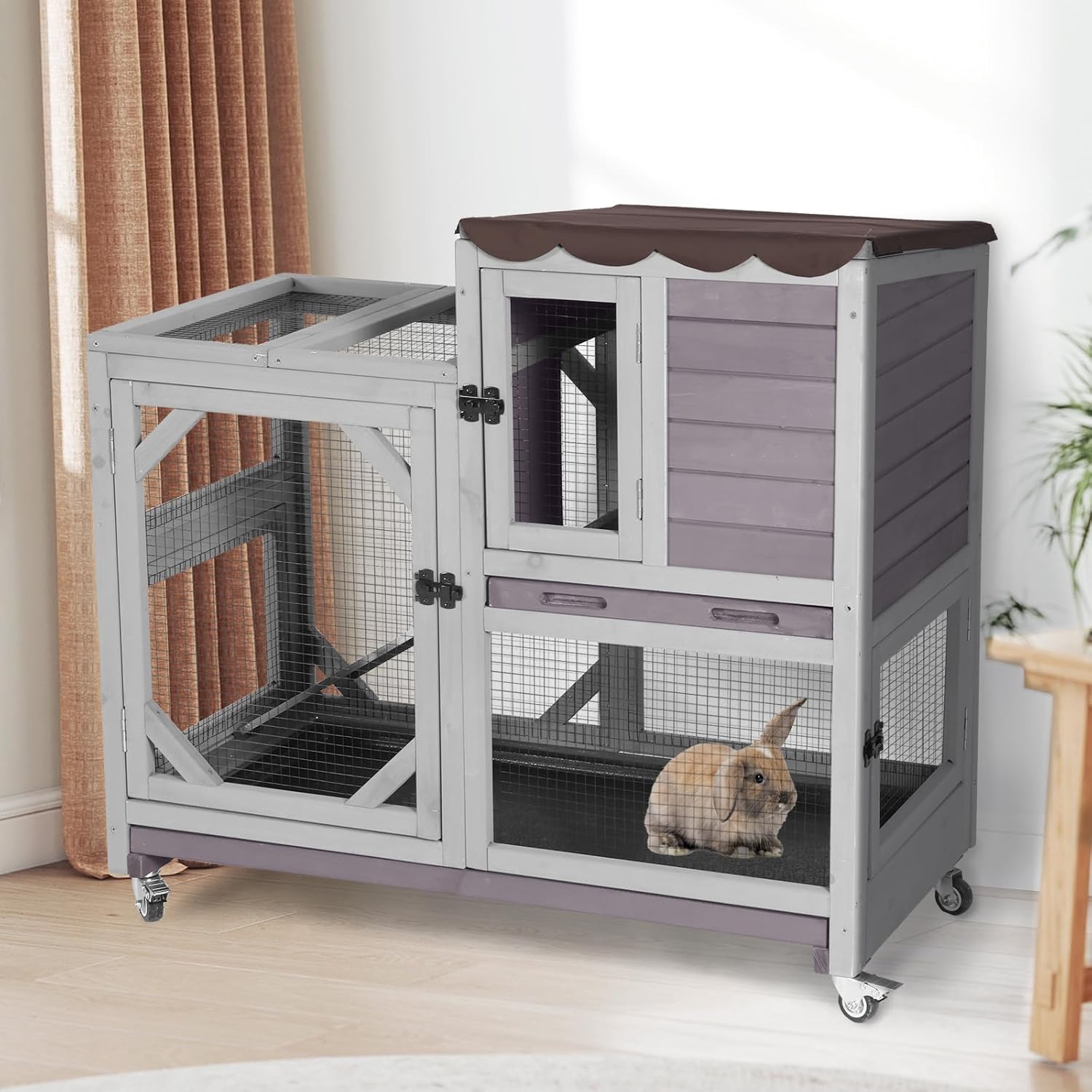 Aivituvin Rabbit Cage Indoor Outdoor Bunny Hutch on Wheels, 2 Story Wood Guinea Pig Cages with 2 Deeper Pull Out Trays (Gray)