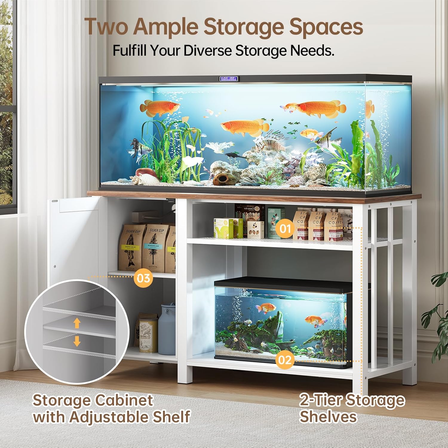 - Spacious storage space: This 55-75 gallon aquarium stand features a storage cabinet with adjustable shelf, providing customizable storage for fish food, filters, and cleaning tools; In addition, the space below of 2-tier stand can accommodate 10-20 gallon fish tanks, making it a versatile option for multi tank setups.