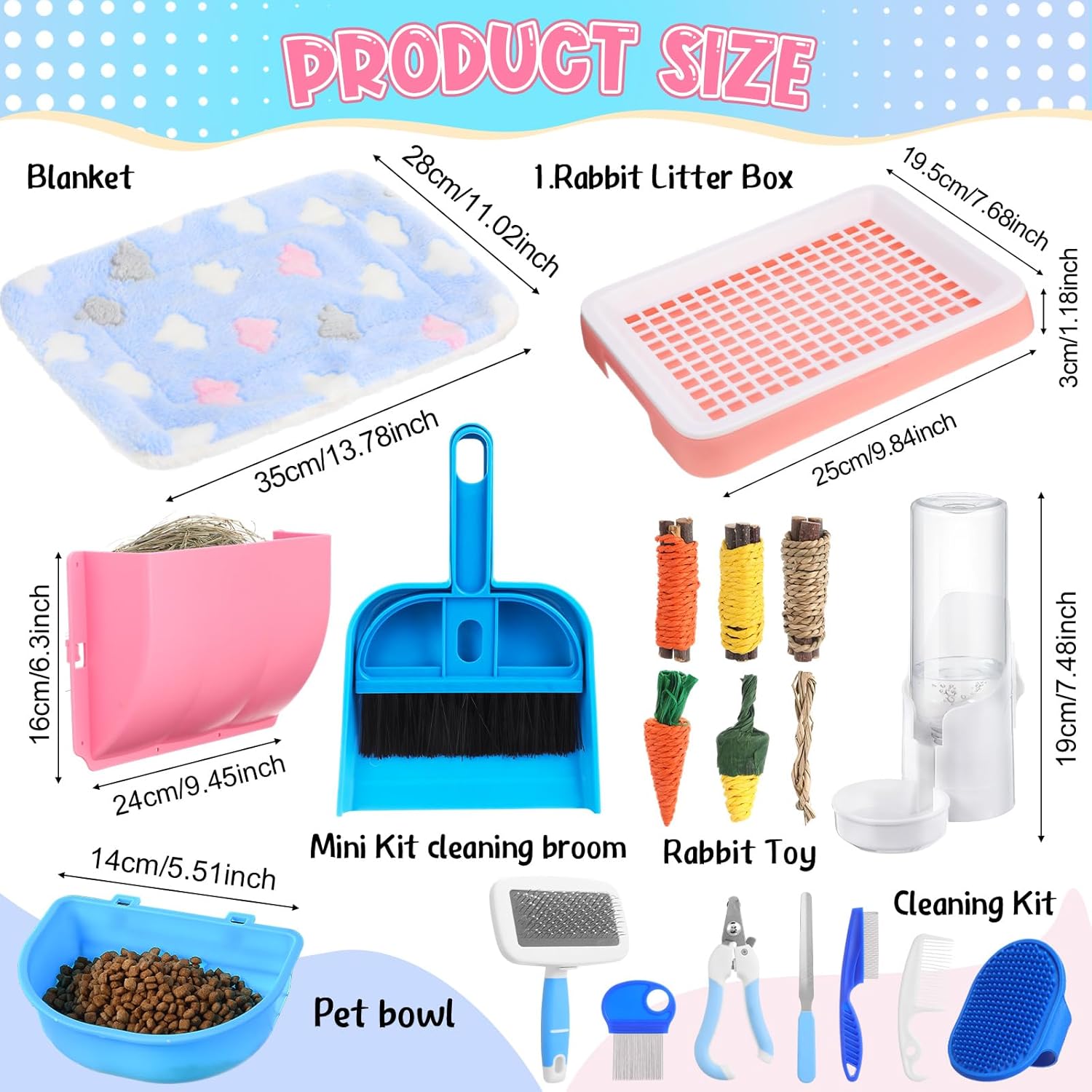 - Convenient and Hygienic: in addition to toys and grooming accessories, the set also provides a comprehensive solution for your pet's overall health; The rabbit litter box, pet bowl, and water feeder solve health problems, while the pet blanket provides a warm and comfortable corner for your pet to rest and relax; It is suitable for rabbits, hedgehogs, guinea pigs, ferrets, and other small animals, providing a clean environment for your pet
