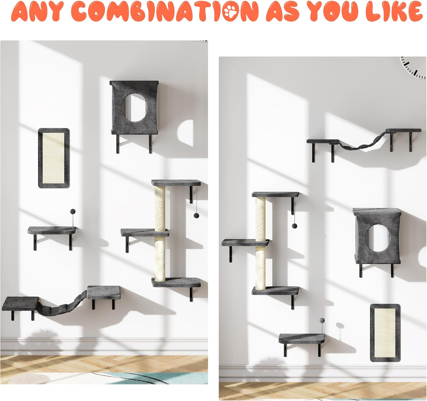 NUNU LAB Wall Mounted Cat Furniture, 5 Pcs Cat Wall Shelves with House, Bridge, Steps, Scratching Post, Shelves, Indoor Safe & Stable Furniture for Kittens Play, Gray