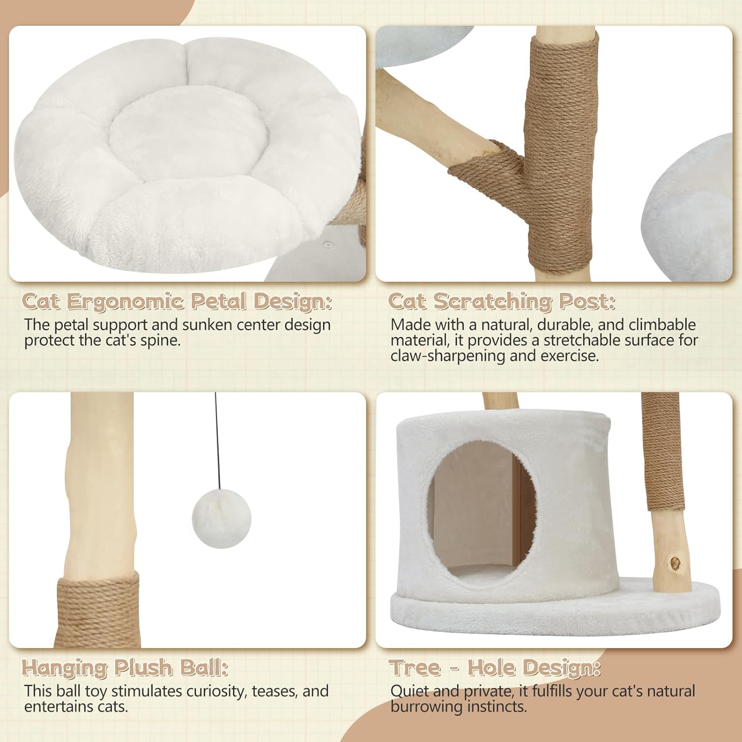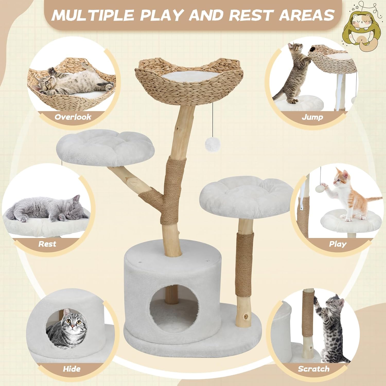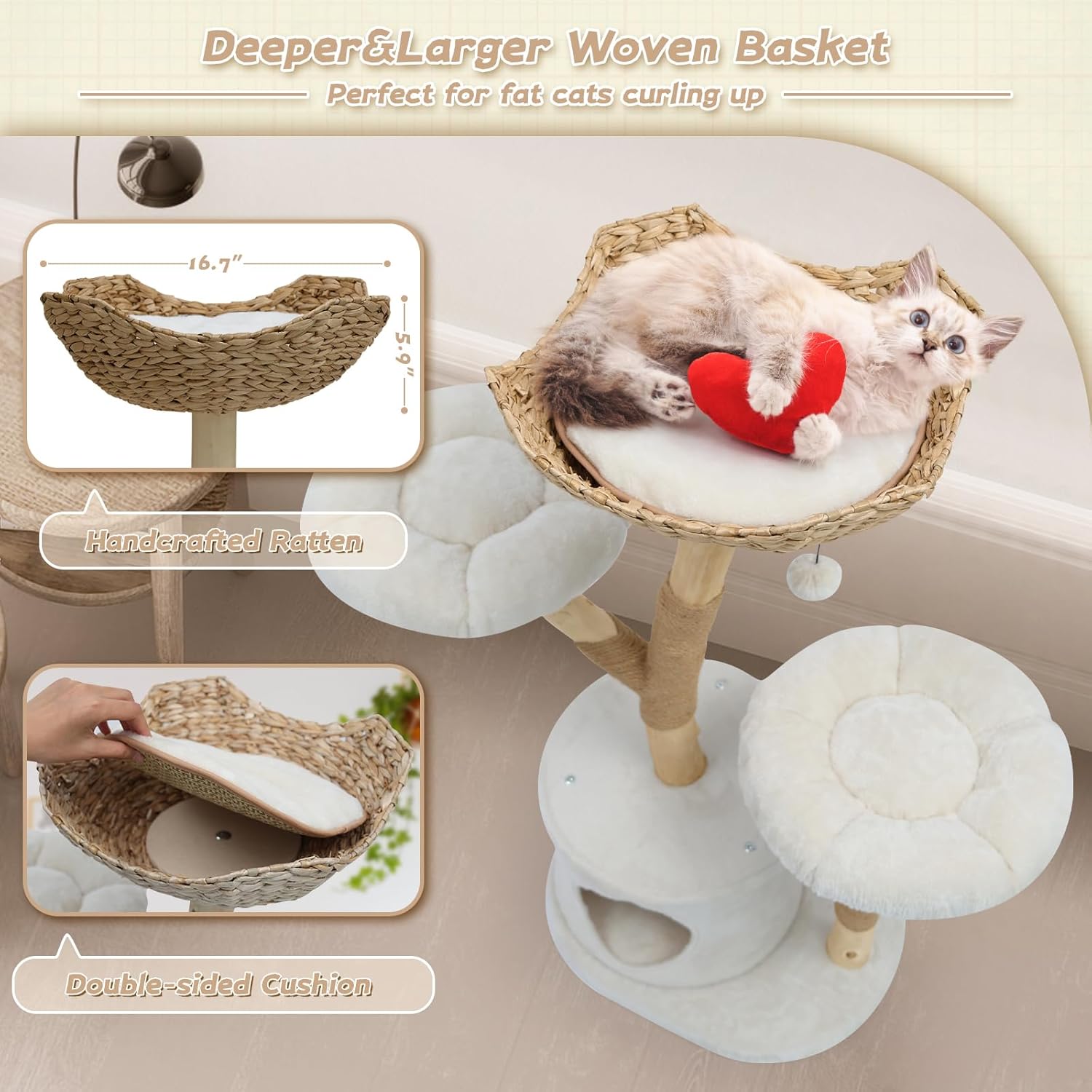 - Multiple Resting & Playing Spots: This cat climbing tower features a hand-woven natural cattail basket with a all-season mat at the top, plush surface and cool surface. It features 2 soft plush flower-shaped platforms for jumping and resting in the middle, plus a cozy private cat condo at the bottom. Two hanging pompoms encourage your little hunters to stretch, bat, and swat for endless entertainment.