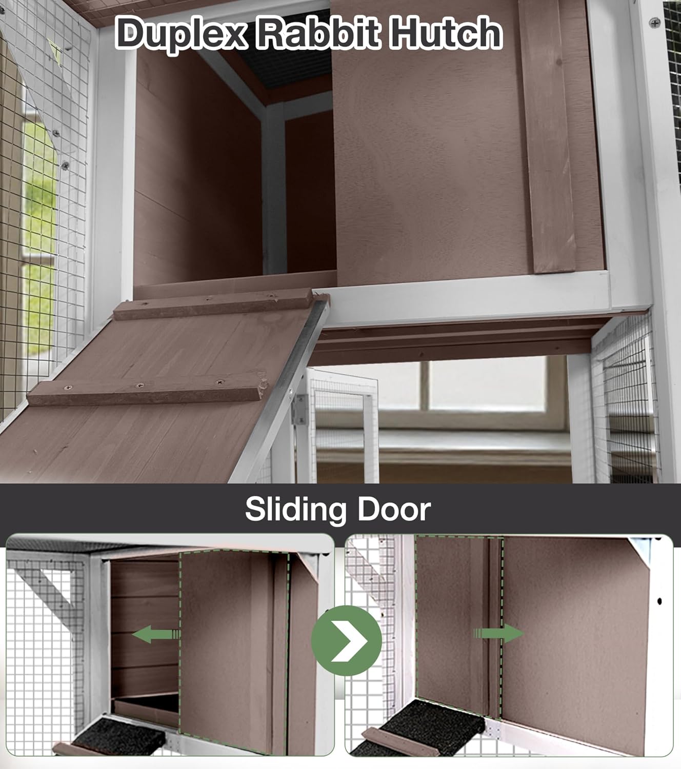 - 𝐃𝐔𝐏𝐋𝐄𝐗 𝐑𝐀𝐁𝐁𝐈𝐓 𝐇𝐔𝐓𝐂𝐇 𝐖𝐈𝐓𝐇 𝐋𝐄𝐀𝐊-𝐏𝐑𝐎𝐎𝐅 𝐓𝐑𝐀𝐘𝐒 - This 2-story bunny hutch includes 2 sliding trays with gap-free wooden baffles, preventing leaks and simplifying waste removal. Ideal for indoor bunny cages and outdoor rabbit hutch setups