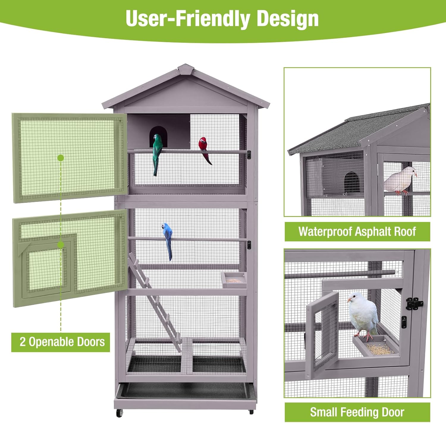- MOBILE DESIGN WITH WEATHERPROOF ROOF: Equipped with four sturdy stainless steel wheels, this bird house moves easily between indoor and outdoor spaces. The asphalt roof offers reliable weatherproof protection.