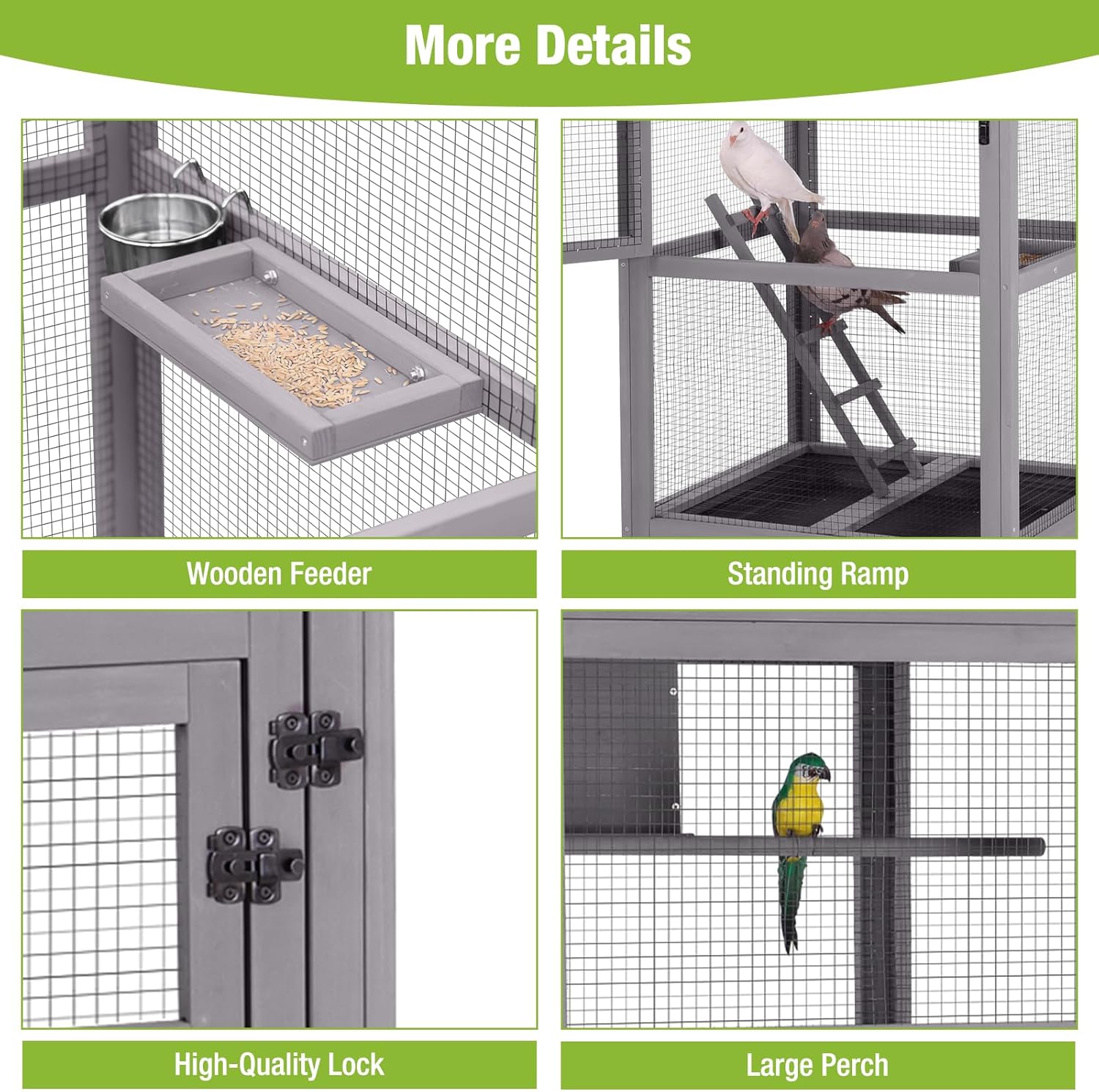- TRAY & WIRE MESH SYSTEM: Thick slide-out tray simplifies feces cleanup, while the bottom wire mesh prevents bird escapes when removing the tray. The mesh also shields birds from outdoor predators.