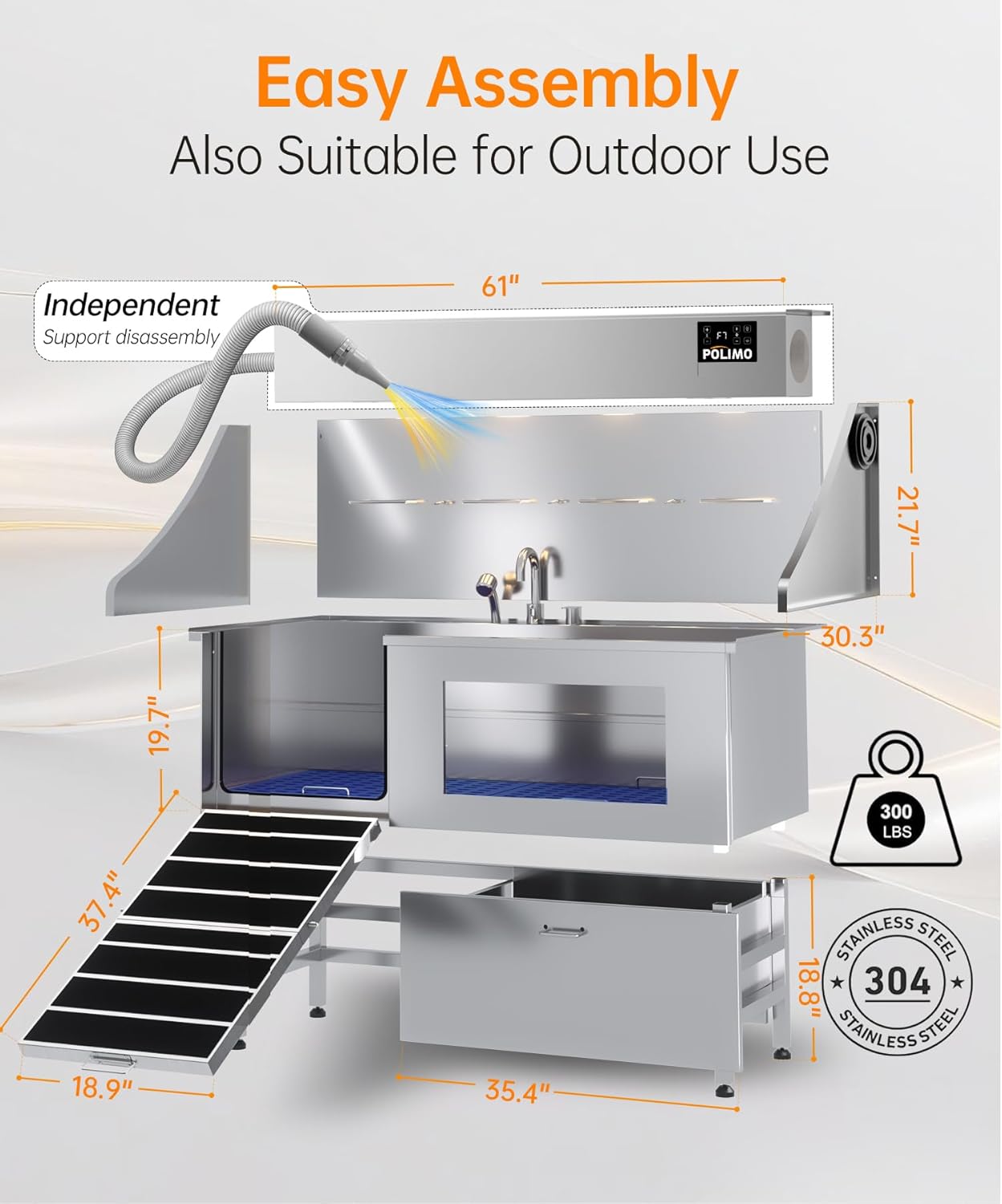 - Premium Stainless Steel Build & Smart Design : Crafted from rust-resistant 304 stainless steel with a full-welded, leak-proof structure, this dog tub is built to last. It features a Grade-A tempered glass viewing window (Eases pet anxiety); A foldable ramp (For easy access, especially for senior dogs); A removable two-piece floor grate (3 height adjustments for large, medium, and small dogs); And a sliding storage drawer (Keeps grooming tools organized). Every detail is designed for a more professional, comfortable, and efficient dog shower tub experience