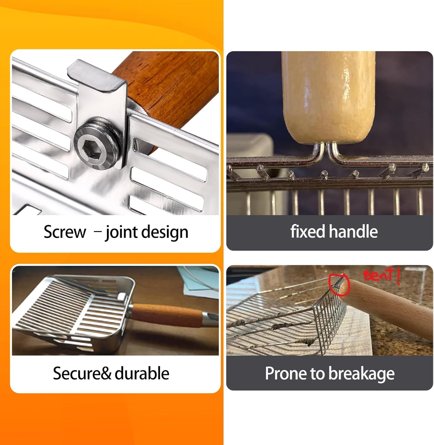 - [Durable 304 Stainless Steel Litter Scoop] Made with 0.7mm thick 304 stainless steel, this cat litter scoop is rust-resistant, sturdy, and long-lasting. The one-piece stamped metal litter scoop design has no weld spots, making it stronger and more reliable than plastic or welded scoops.