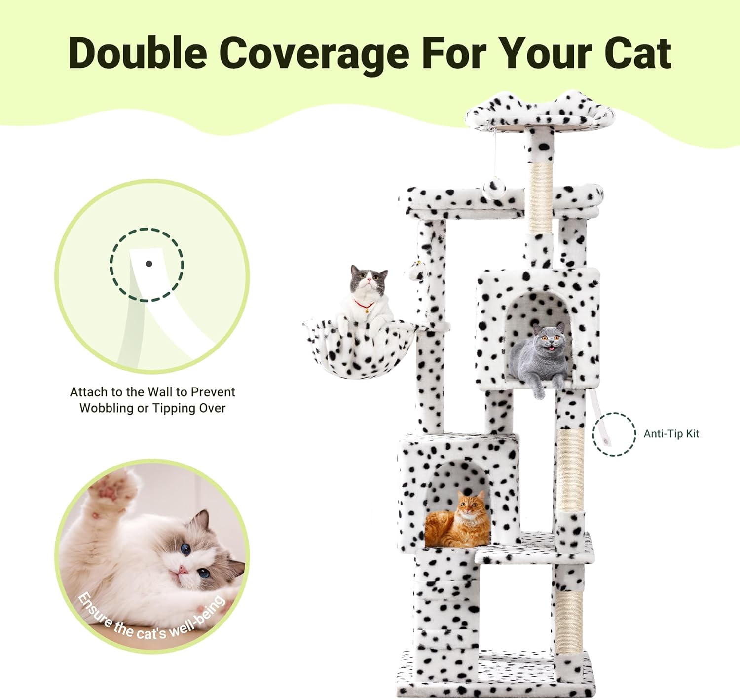 Allewie 64 Inches Cat Tree Tower/Multi-Level Activity Center for Indoor Big Felines/2 Plush Condos/2 Perchs/Basket/House/Sisal Scratching Posts/Hanging Cat Toys/White & Black Spot