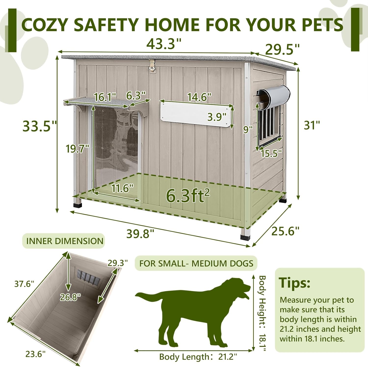 - 【SIZE & EASY ASSEMBLY】Overall Dimensions: 43.3"L x 29.5"W x 33.5"H, offering a spacious 6.3 sq. ft. interior for your pet to relax comfortably. Pre-drilled holes and detailed instructions make assembly fast and hassle-free, so you can provide your pet with a secure, cozy shelter in no time.