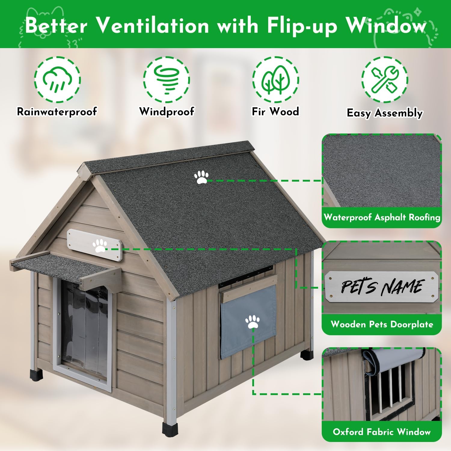- 【All-Season Comfort】 Our upgraded flip-up window is made from breathable oxford cloth with an easy-to-use hook-and-loop closure. Roll it up for ventilation during hot summer days or close it to keep out cold wind and rain. This weatherproof and insulated outdoor dog house offers reliable year-round protection, ensuring your pup stays cozy and safe in all seasons.