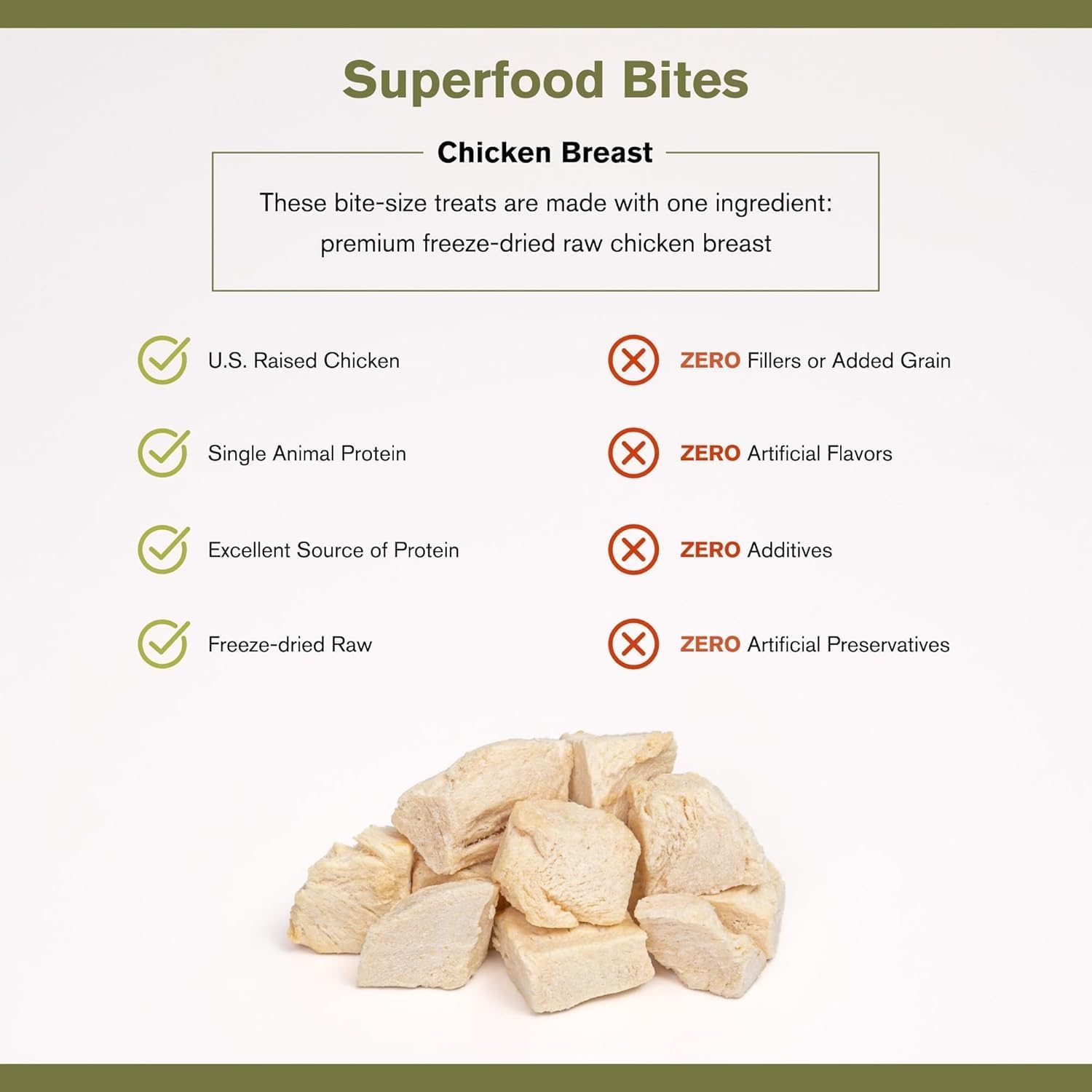 - Superfood Bites are crafted with nutritious, premium grade, USA-raised chicken breast.