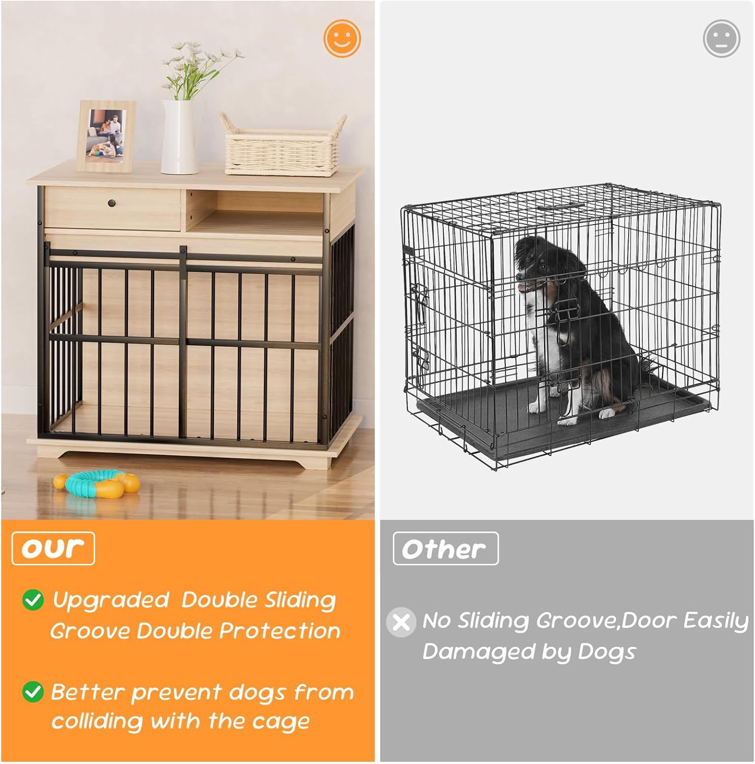 - Reliable & Sturdy Built: Dog crate feature 0.47" steel fence, this piece of dog crate furniture is sturdier and more chew-resistant than wooden dog crates. Dog crate furniture large breed uses double sliding door design. The front of the wooden dog cage is designed with a lockable sliding door, which looks modern elegant and saves space