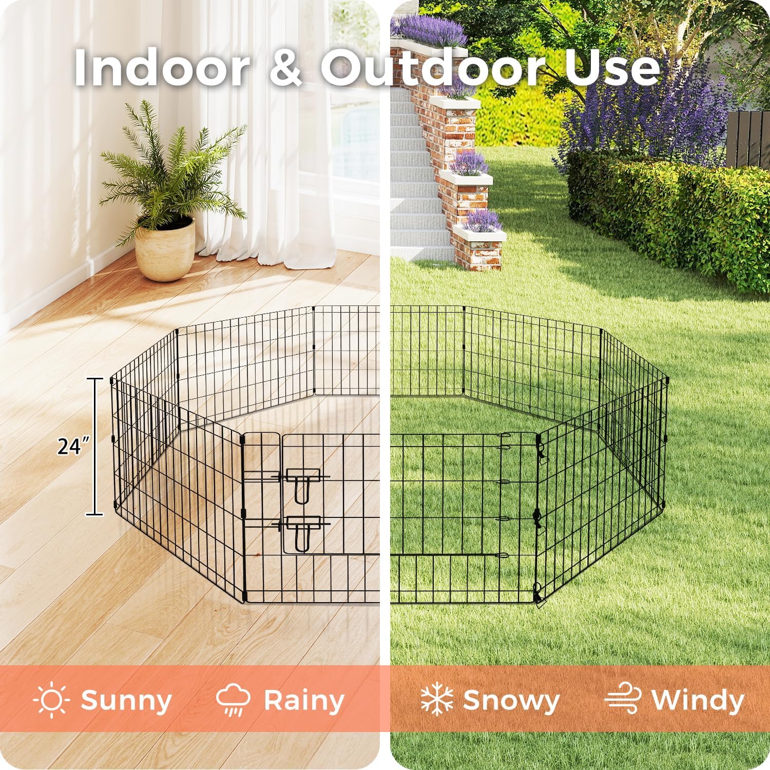 - Indoor/Outdoor Use: Constructed with rust-proof metal, this dog playpen outdoor withstands rain/snow/sun. Use as dog playpen indoor with rugs/mats, or secure with stakes as sturdy dog fence for yards/RV camping/patios.
