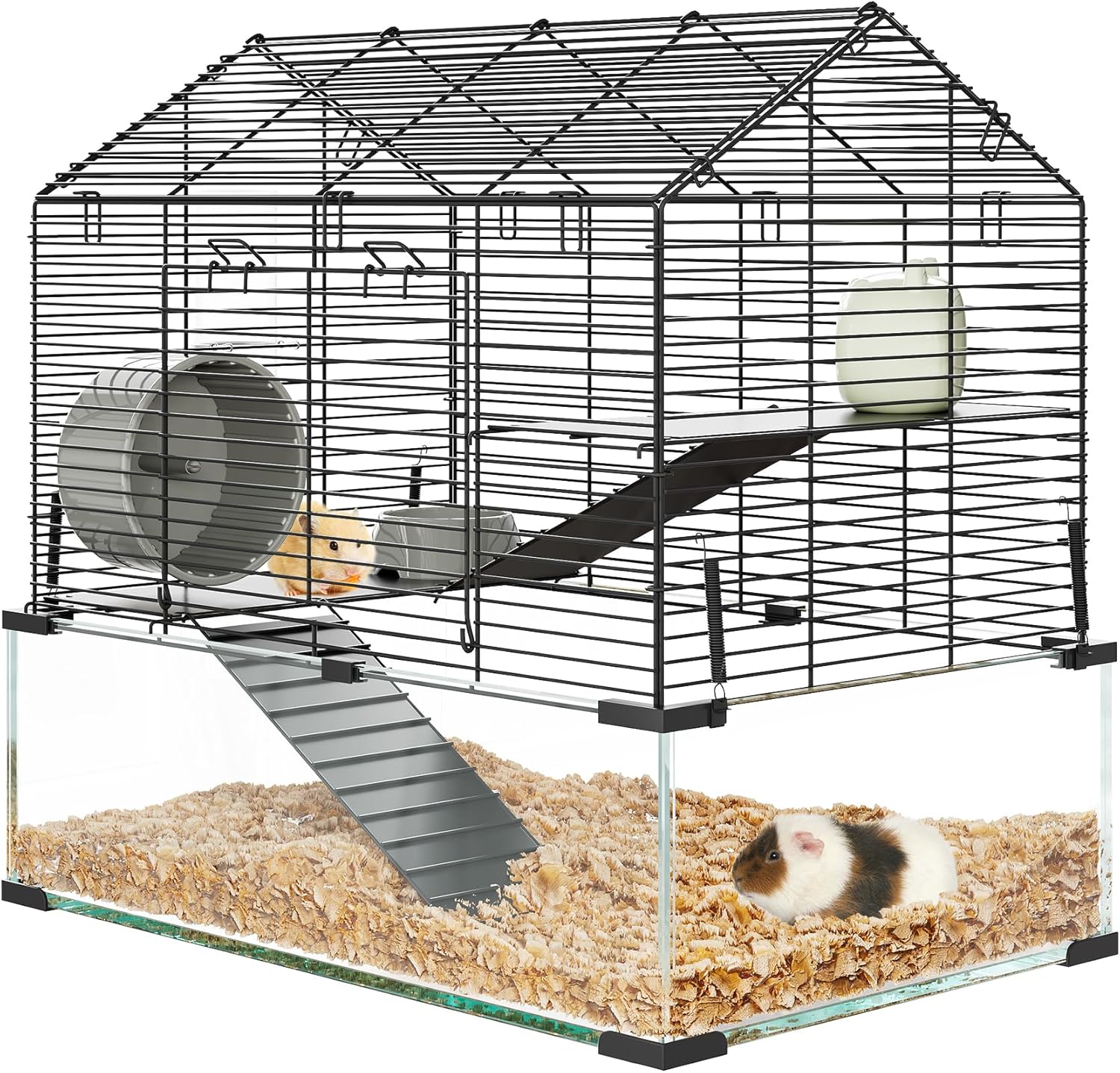 - 【Natural Habitat Design】: This rat cage has a tempered glass bottom that is fit for adding paper or wood chips to create a cozy, natural space for your hampster. The transparent glass bottom lets you watch your hamster's actions in real-time.