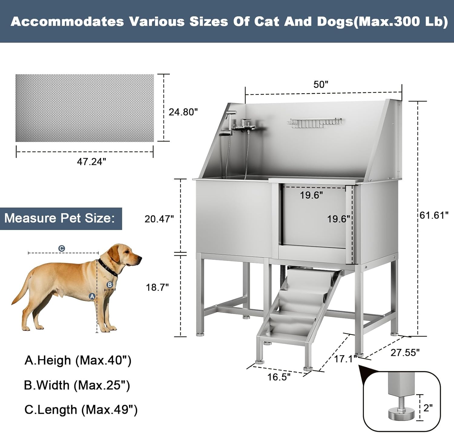 - 【Efficient Drainage and Leak-Free】:This dog wash station is equipped with a high-performance drainage system and integrated filter to prevent hair clogs. Our sewer hose connectors have screw-in threads and and the drain port is installed more securely. Stainless steel tub use seamless welding technology ensuring that the entire wash sink is leak-free and long-lasting use.