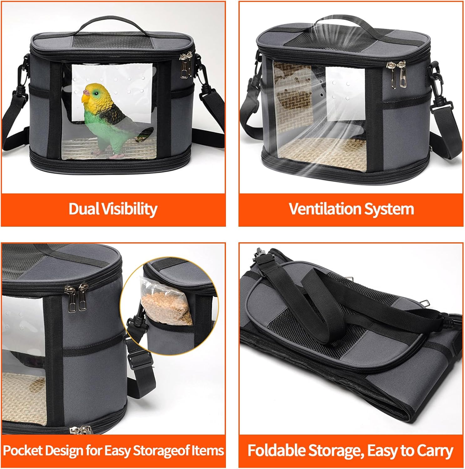 - [ Bird Travel Carrierm ] : Breathable design.With large and vent holes and mesh, pet carrier cage provides optimal ventilation and airflow to your bird. Front transparent window allows great scenery view while travel.