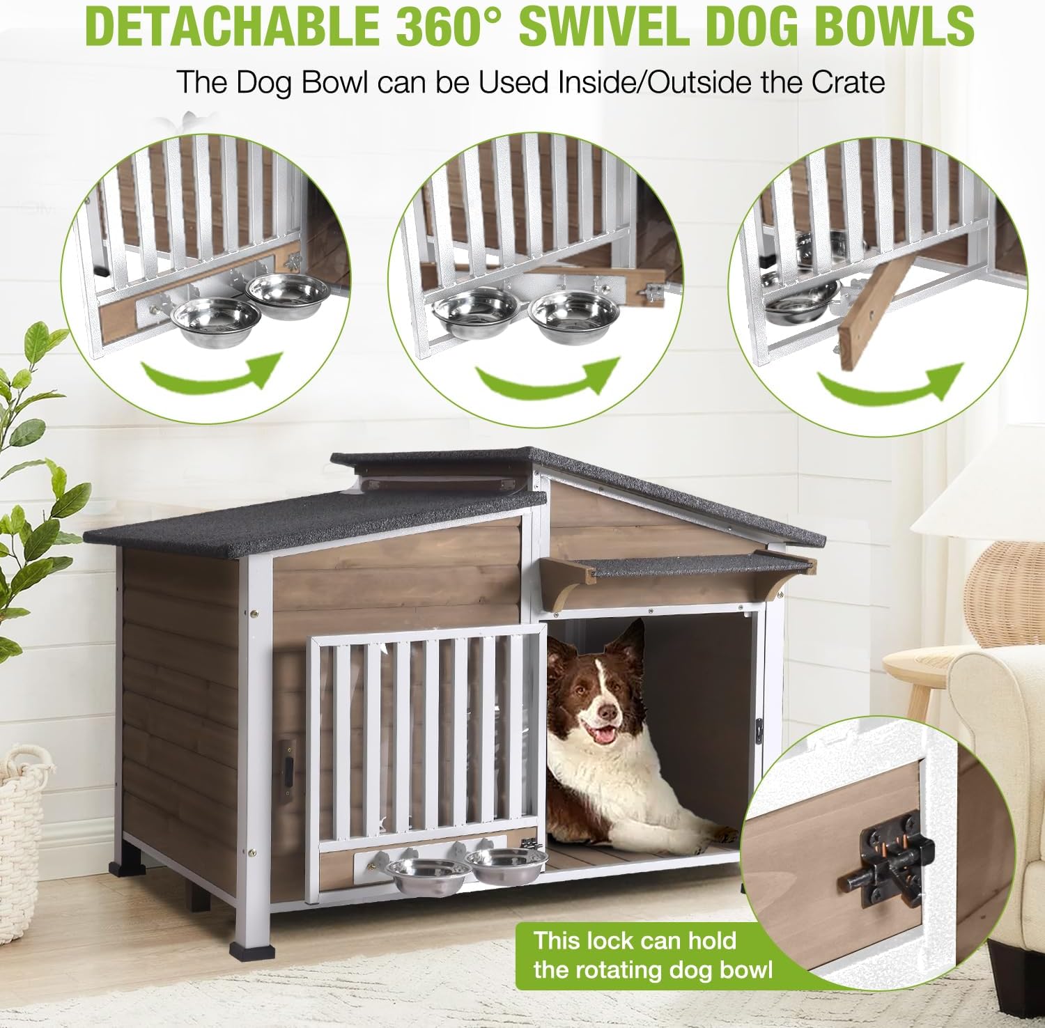 Dog House Outdoor with Bowls Weatherproof Dog Kennel with Anti-Chewing Iron Frame Dog Shelter for Small Medium Dogs(Light Brown)