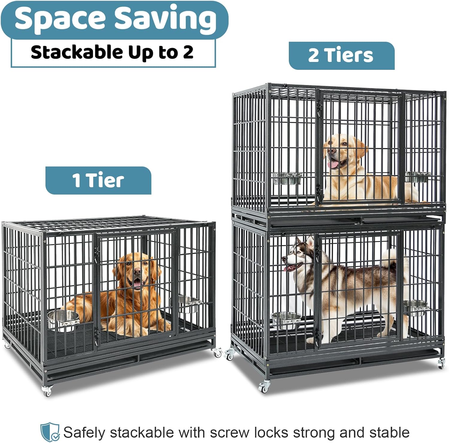 48 Inch Heavy Duty Large Dog Crate, Stackable Indestructible Big Cage for High Anxiety Dogs, Foldable Escape Proof XL Dog Kennel Indoor with Adjustable Bowls, Wheels and Double Trays(2 Pack)
