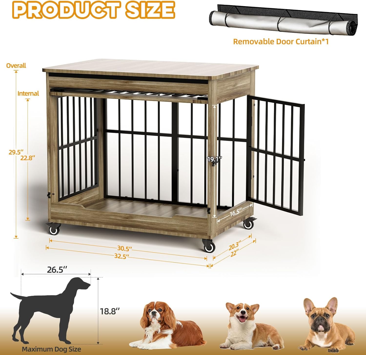 32" Dog Crate Furniture, Double Door Wooden Indoor Dog Kennel Furniture, Decorative Pet Cage End Table with Wheels for Medium and Small Breed Dogs, Size M, Rustic Brown